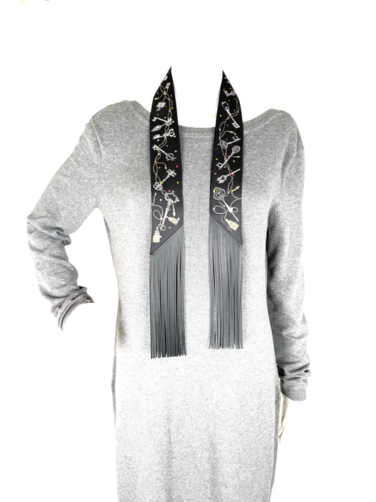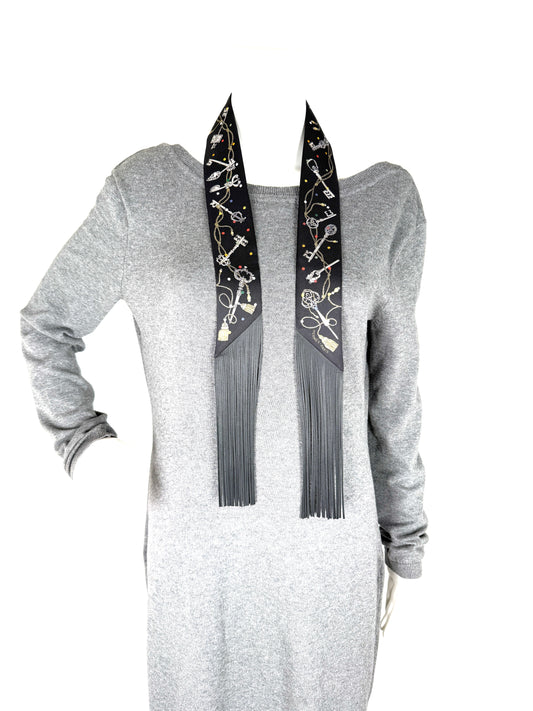 HERMES Les Cles a Pois Black Mordore White Silk Calfskin Leather Fringes Twilly Scarf New