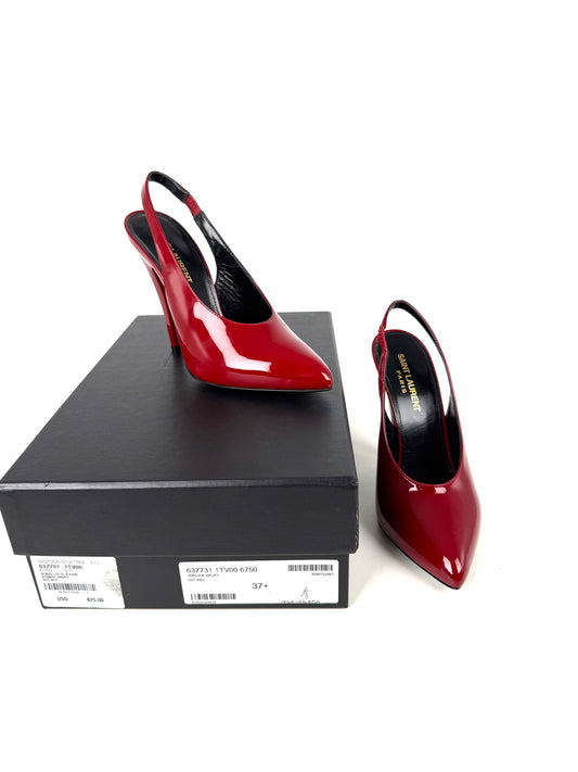 Saint Laurent YSL Venus Hot Red Patent Leather Slingback Pumps Heels 37.5, 7 New