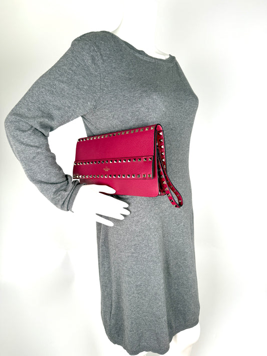Valentino Garavani Rockstud Rose Violet Raspberry Pink Leather Clutch Bag New
