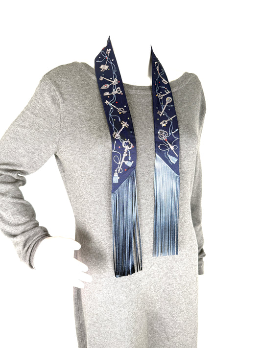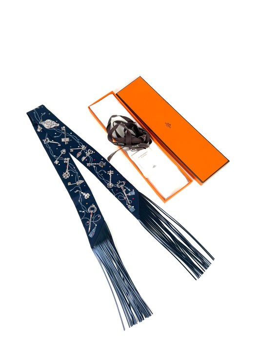 HERMES Les Cles a Pois Bleu Marine Gris Argent Silk Calfskin Leather Fringes Twilly Scarf New