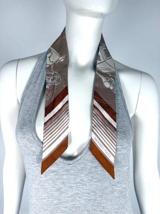Hermes Ex Libris Horse Carriage Print Beige White Caramel Silk Twilly Scarf