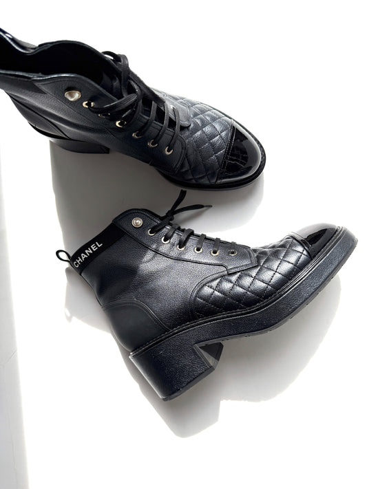CHANEL Cap Toe Faux Pearl Black Quilted Block Heel Combat Ankle Boots 41, 10.5