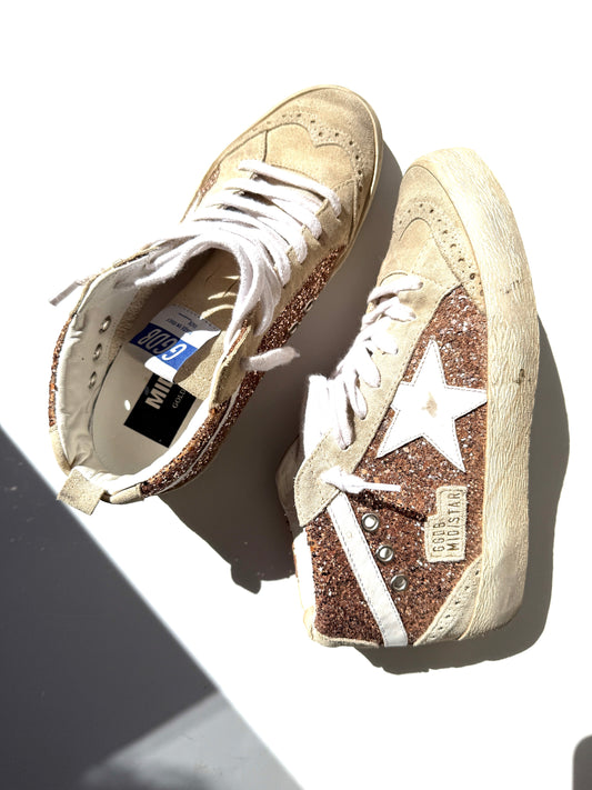 Golden Goose Midstar High Top Black Rose Gold Glitter Sneakers 37