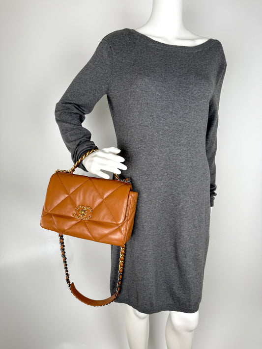 CHANEL 19 Small Carmel Brown Lambskin Gold Hardware Flap Bag