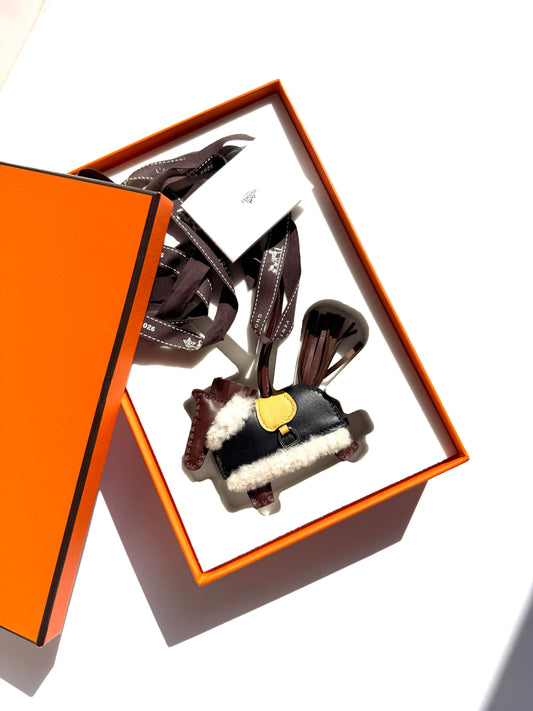 HERMES Rodeo Robeo Plush Charm PM Terre Paille Black Ecru Milo Lambskin and Wool Palladium Hardware New in box