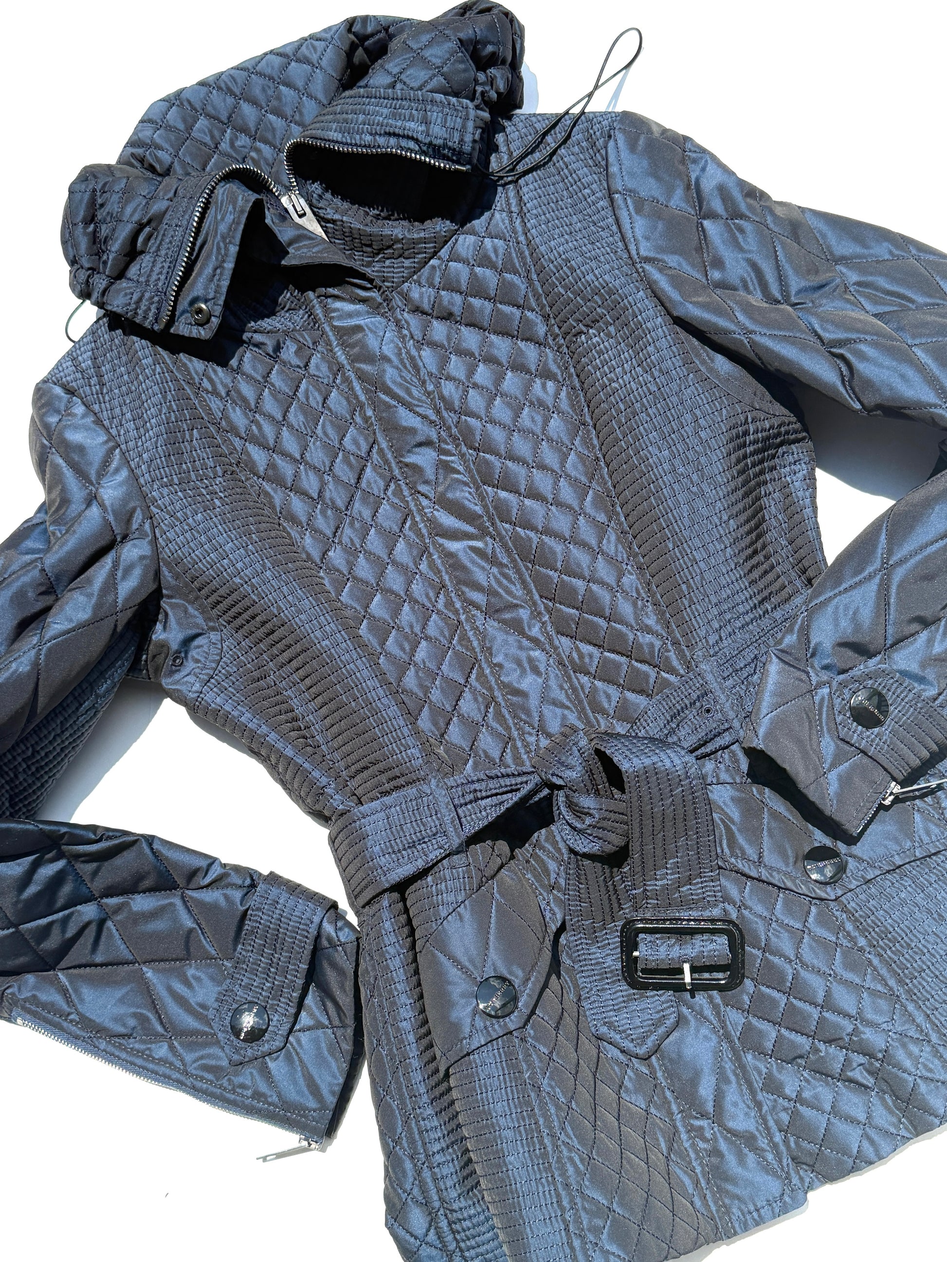 Features: Two front pockets, quilted, belted.