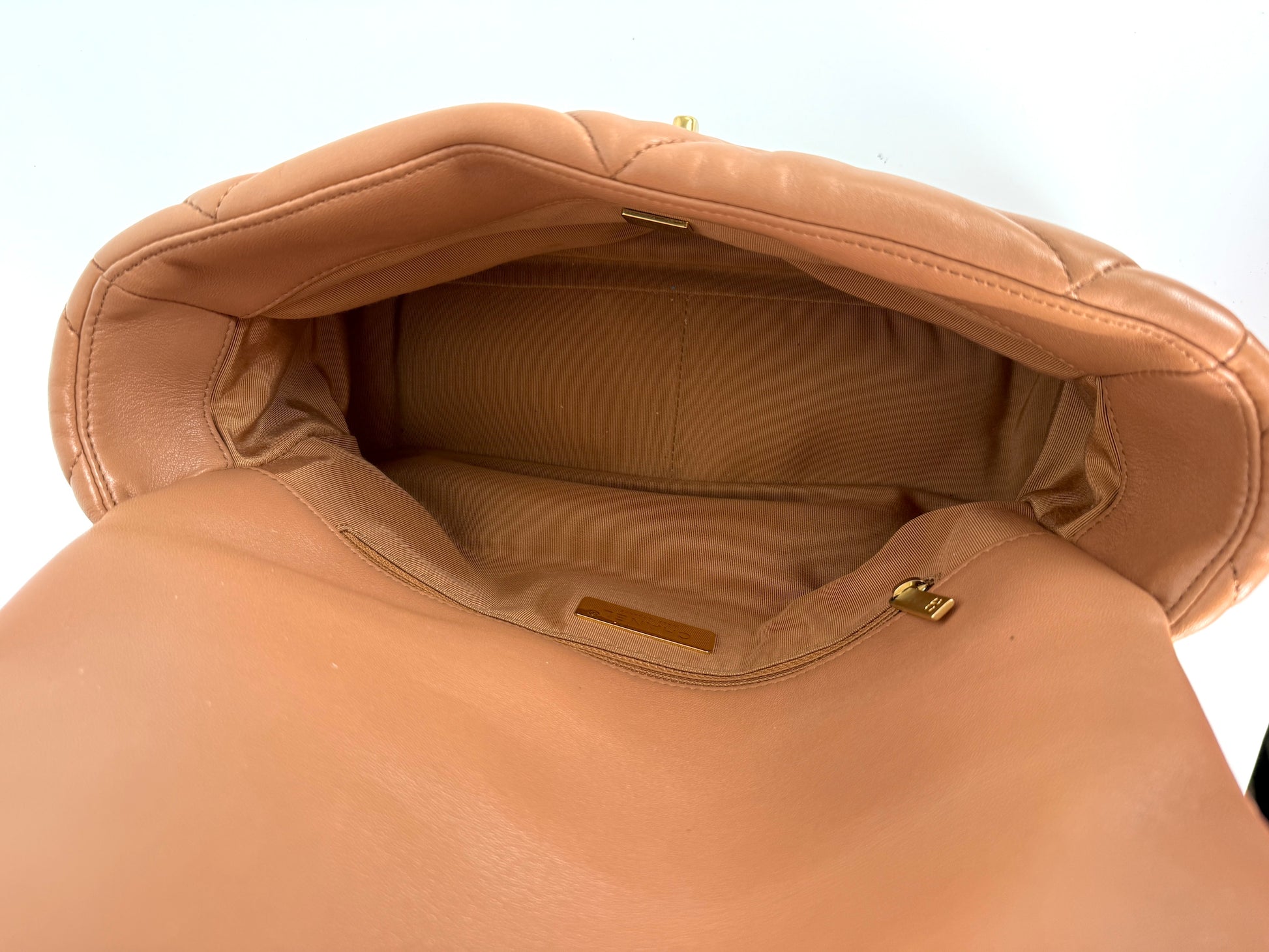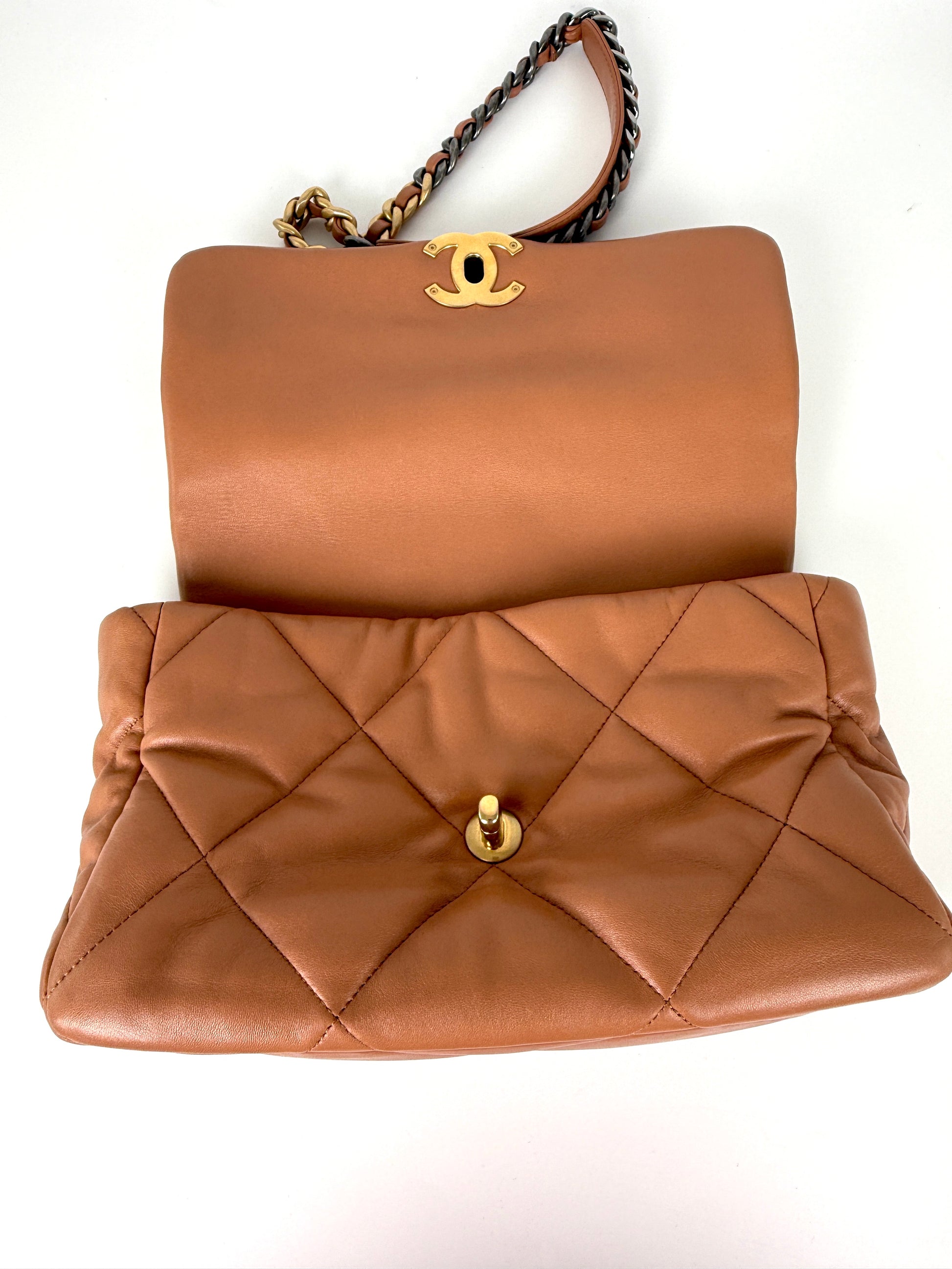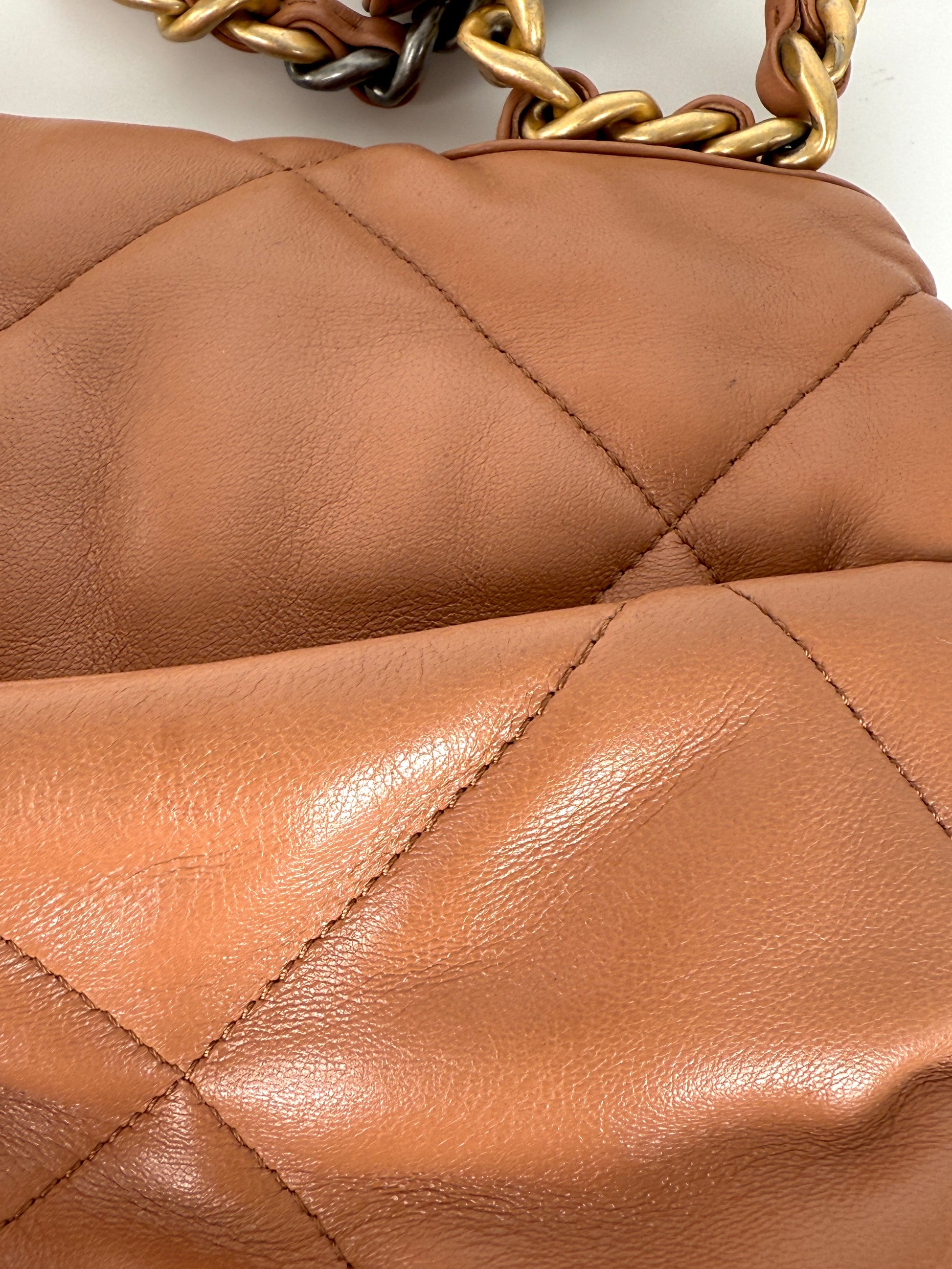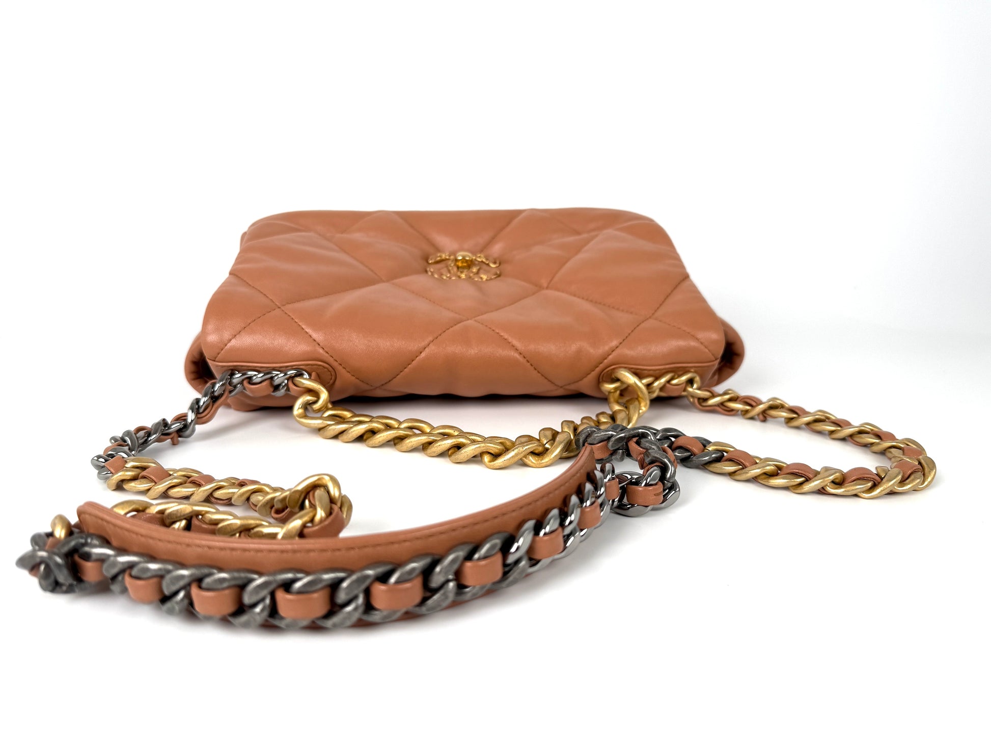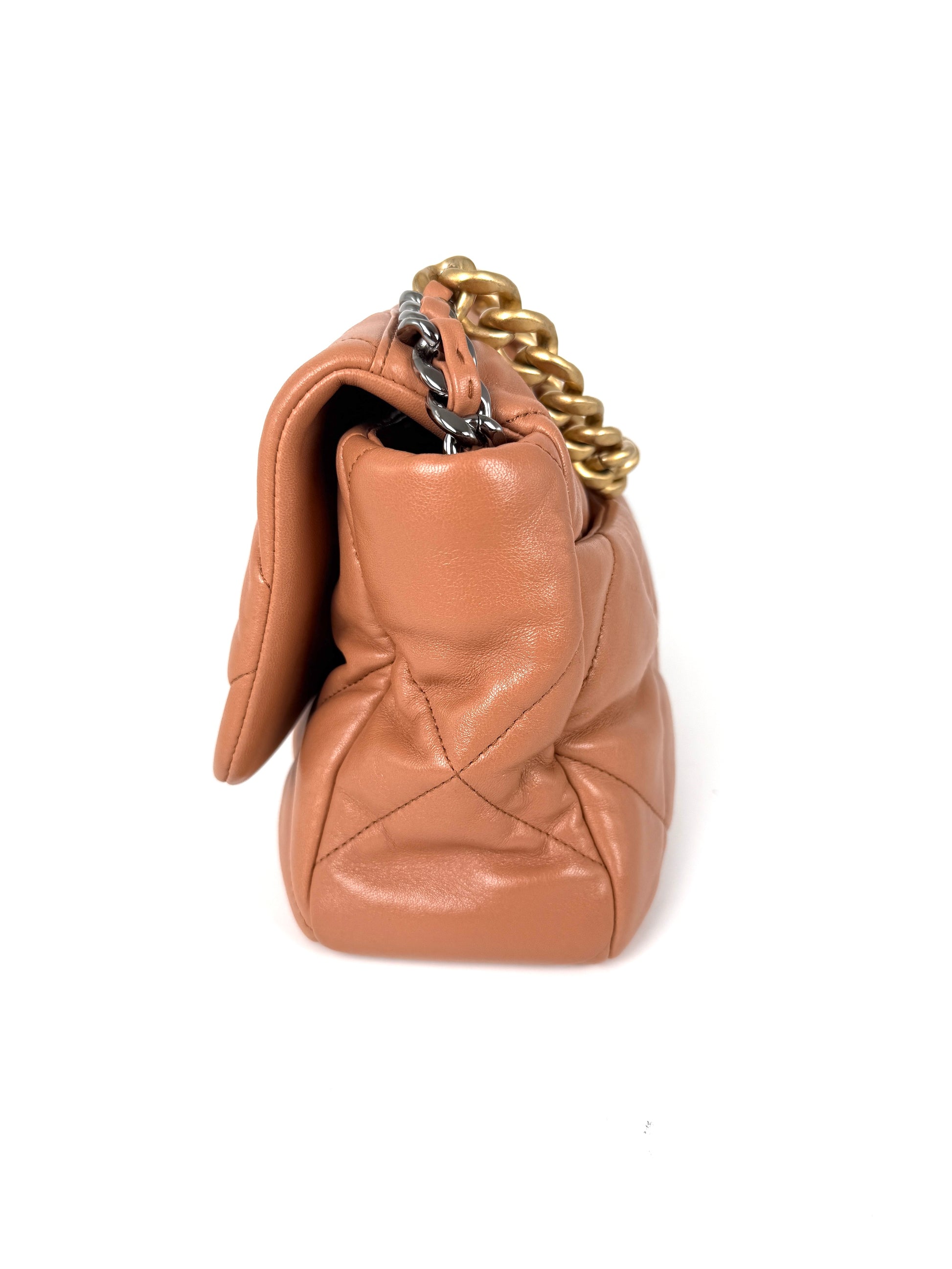 Get this classic brown Chanel 19 bag for less than retail. The exterior pocket will come in handy to store your phone for easy access. It was purchased in October 2021 in Las Vegas.