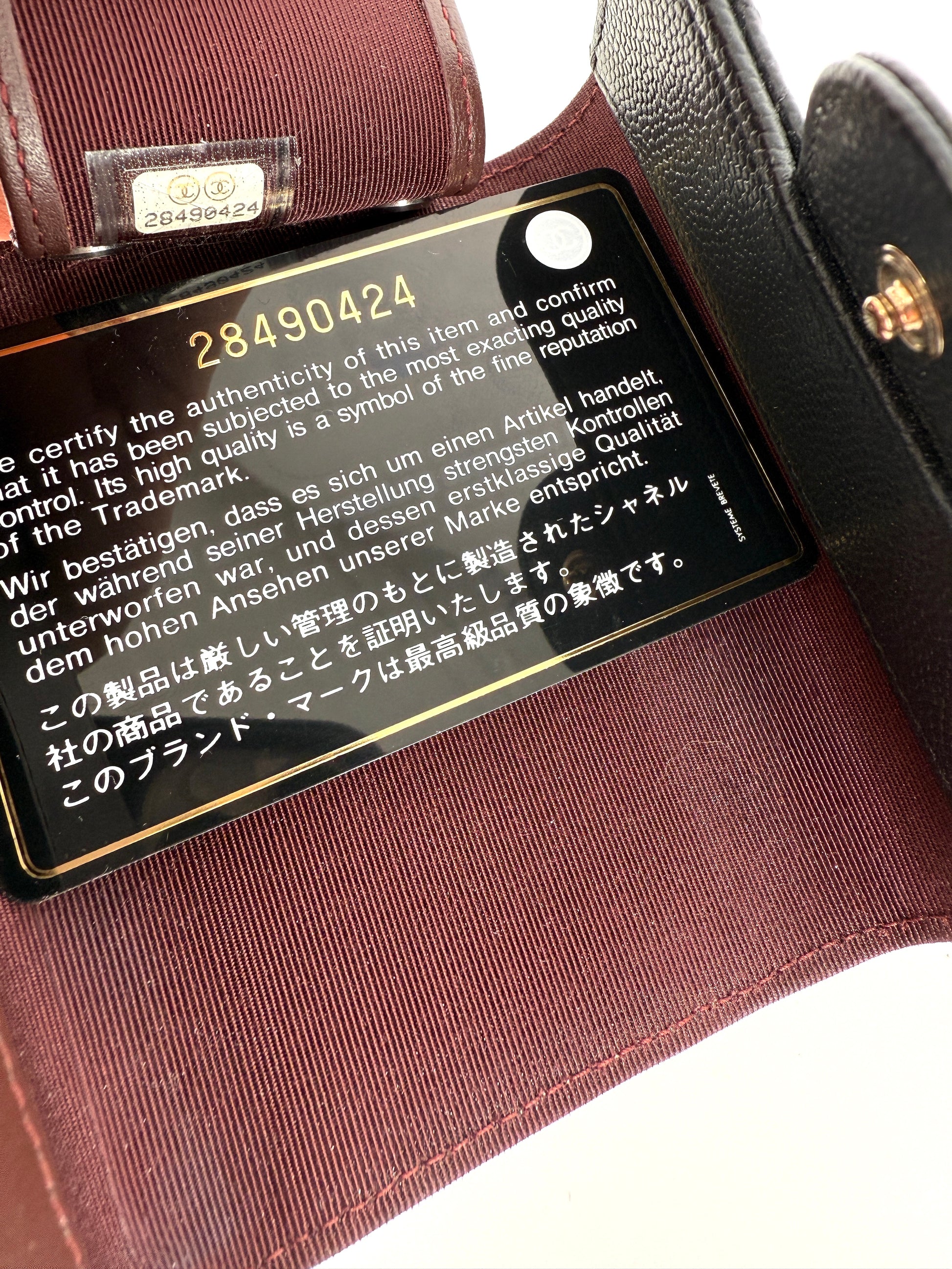 Includes: Dust bag, box, price tag, ribbon, camelia, care booklet.