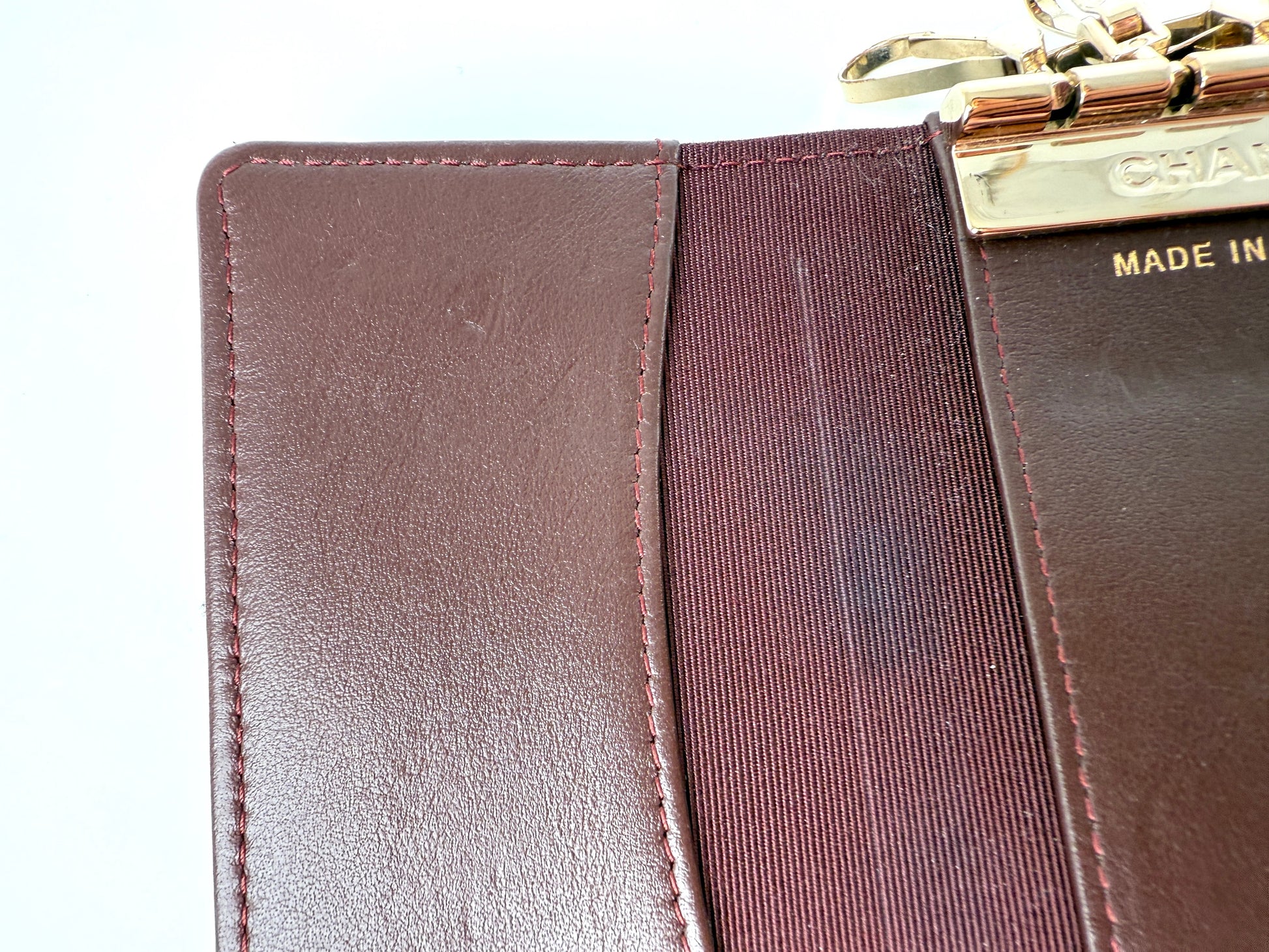 Store your keys in one place with this Chanel key holder. It has an exterior and interior pocket to fit your ID or credit card.