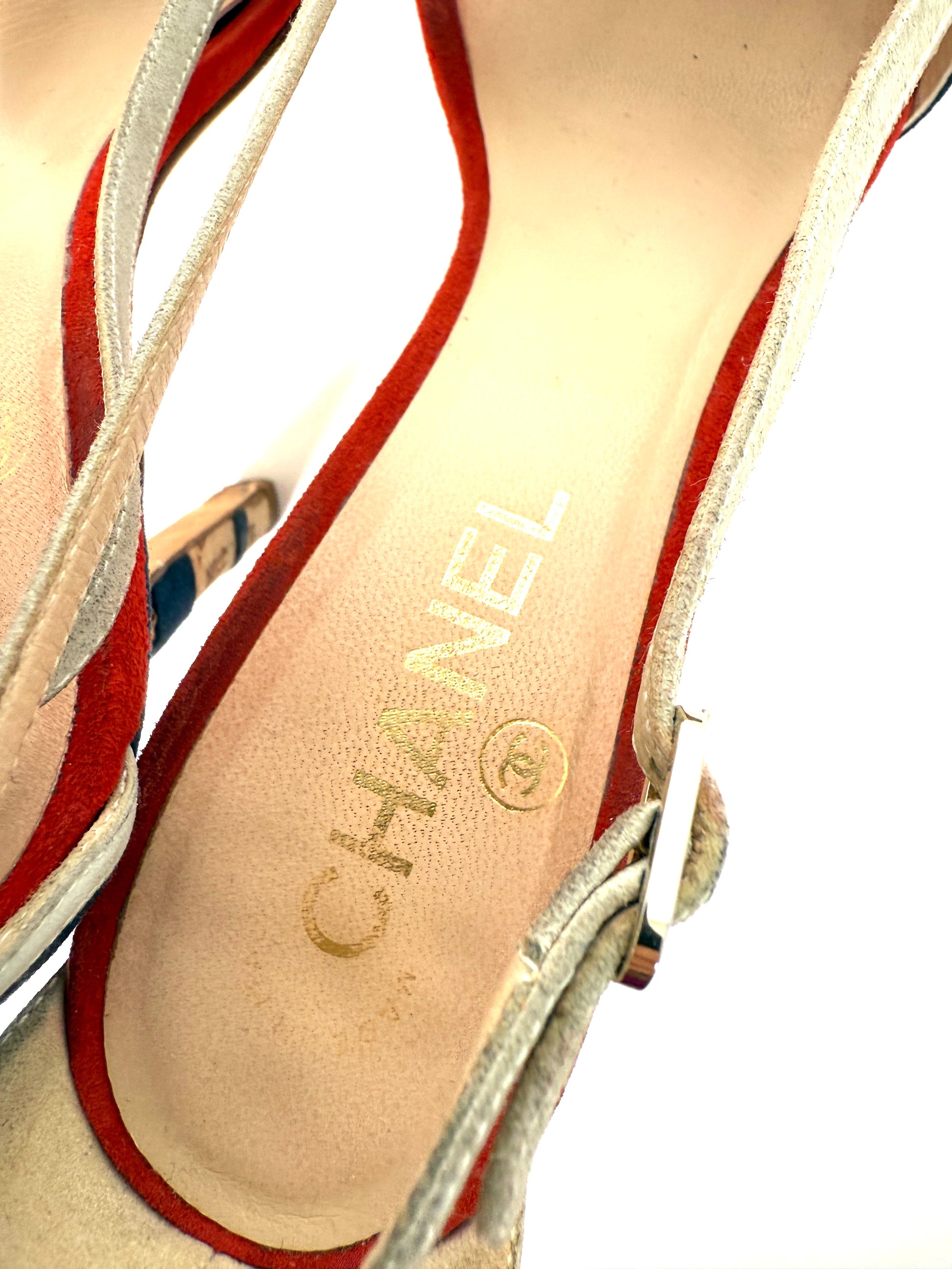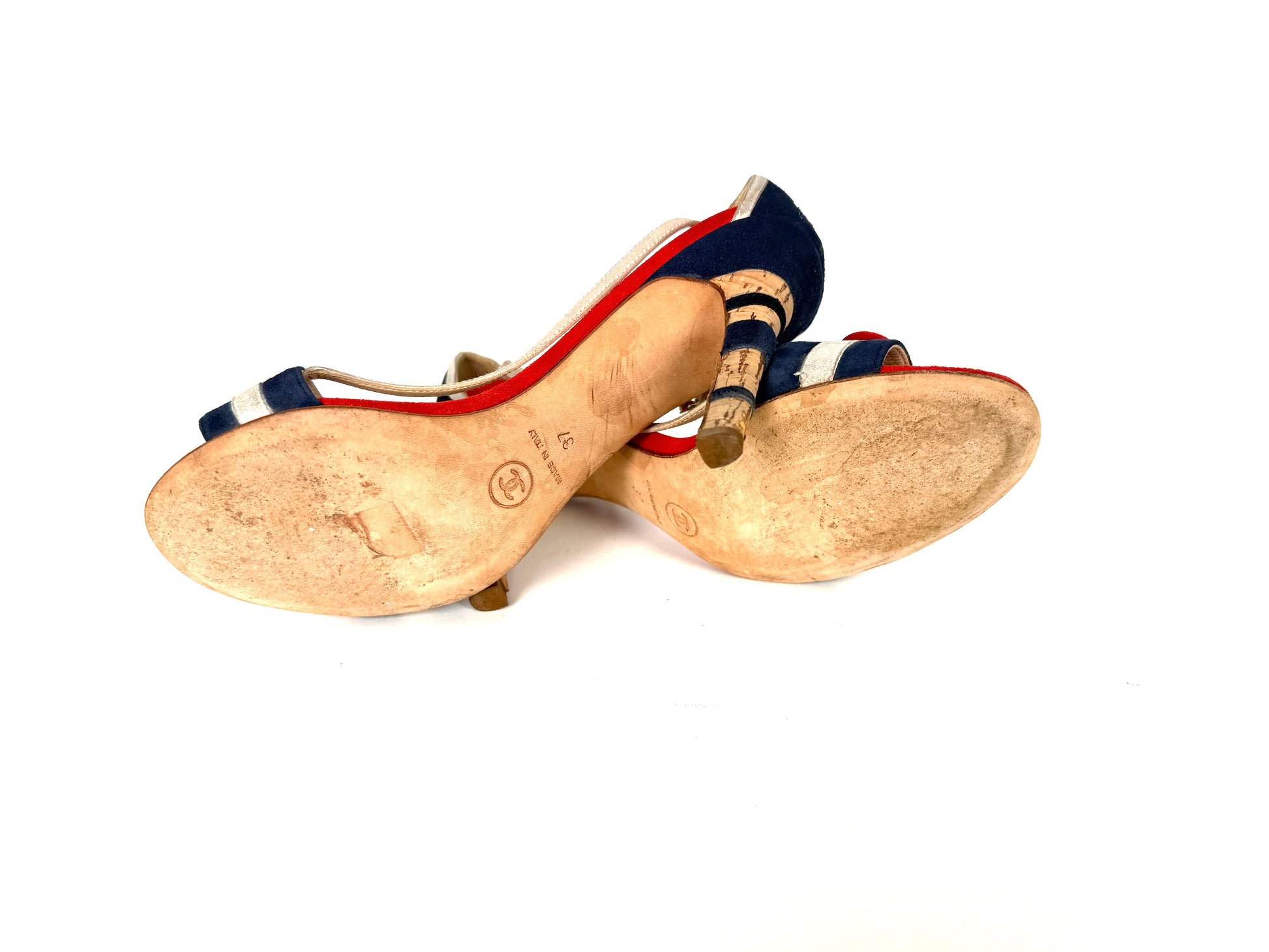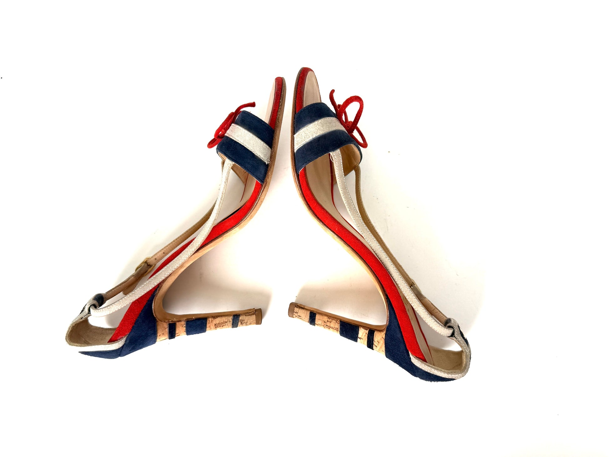 CHANEL Red Blue White Suede Bow CC Cork Heel Sandals Heels 37 6.5