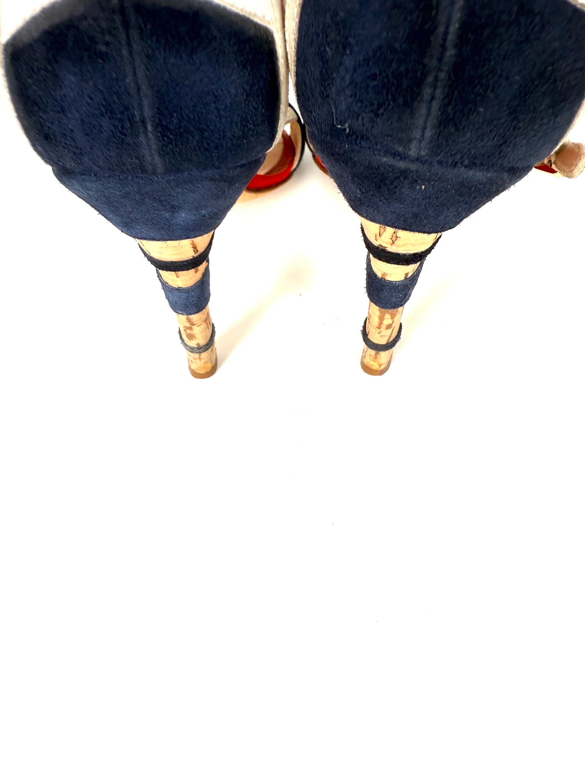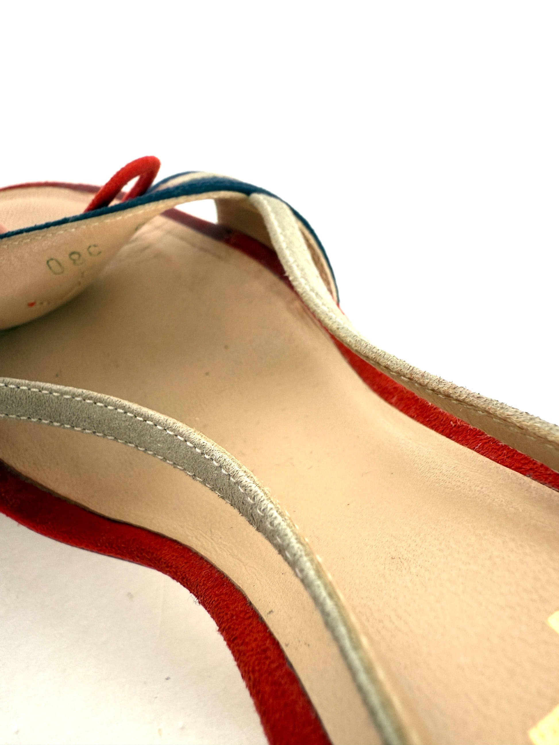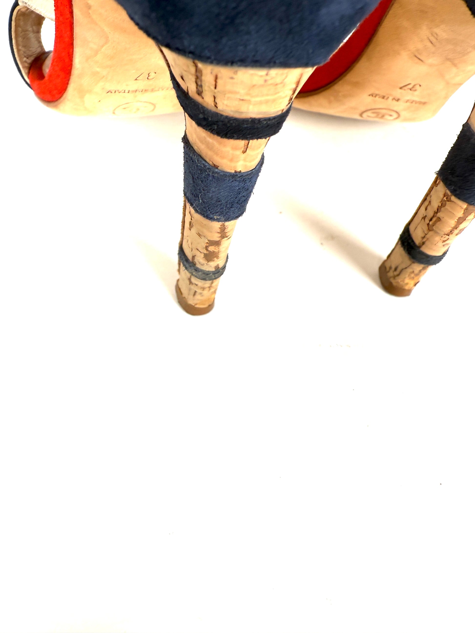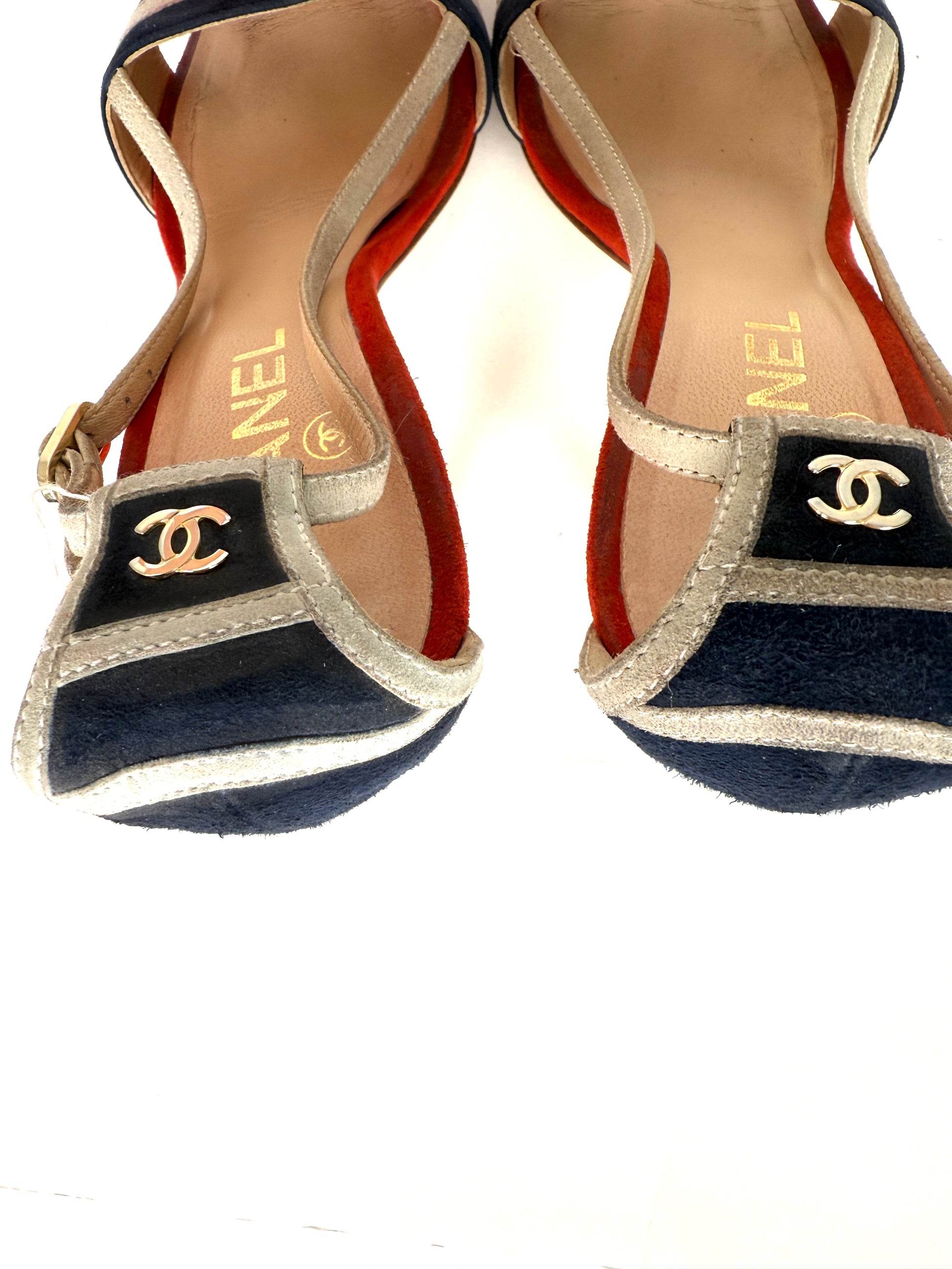 CHANEL Red Blue White Suede Bow CC Cork Heel Sandals Heels 37 6.5