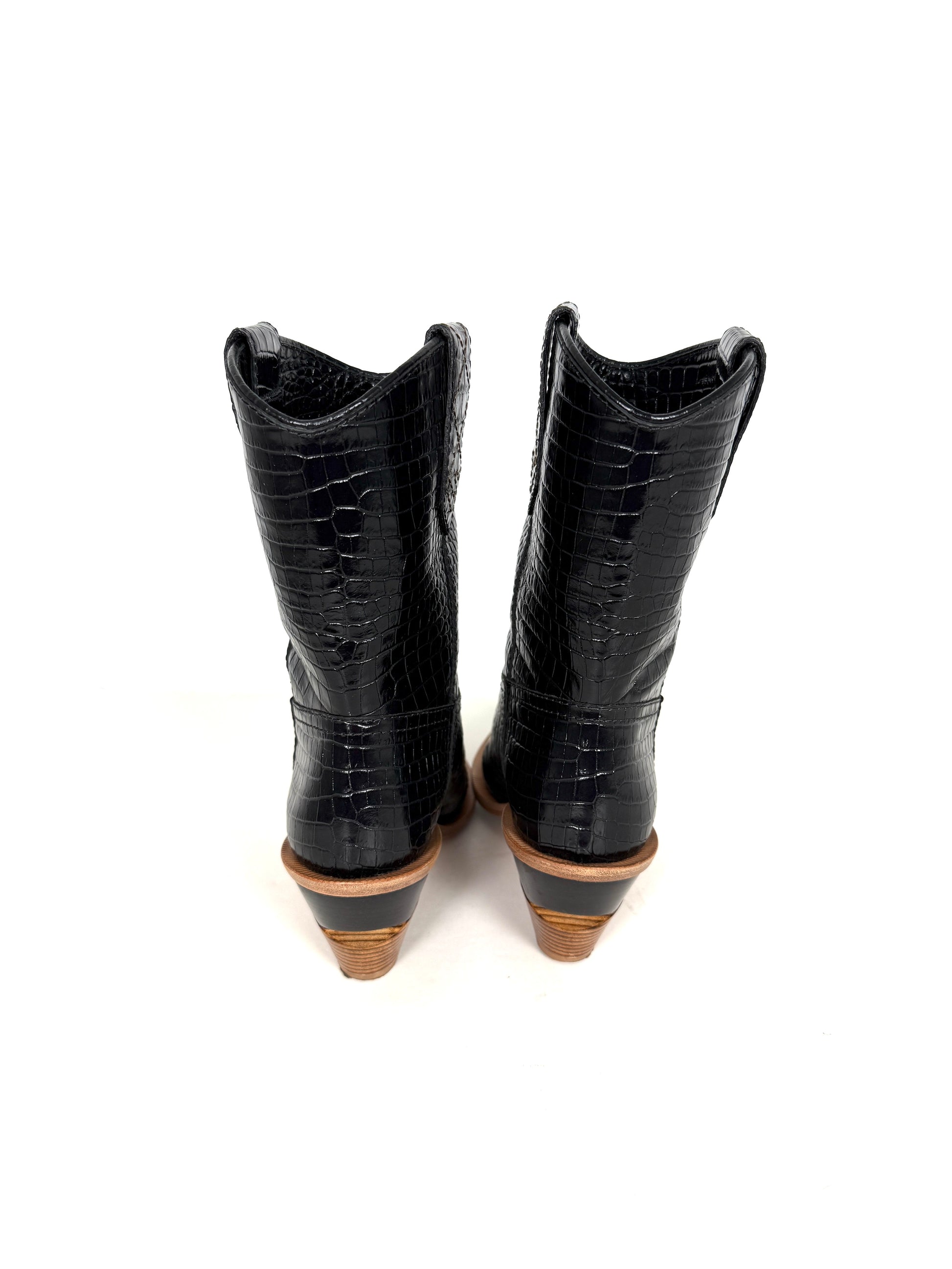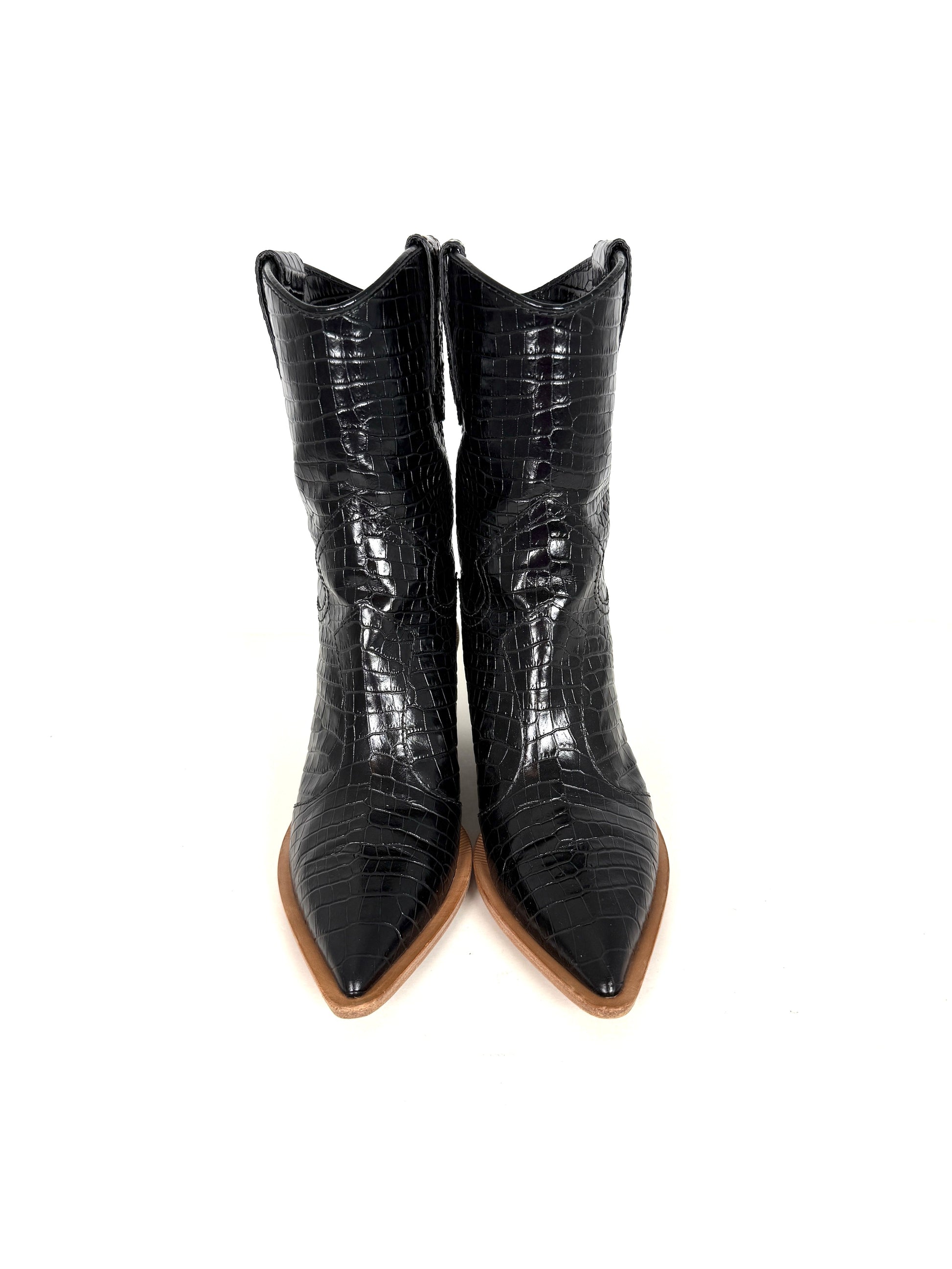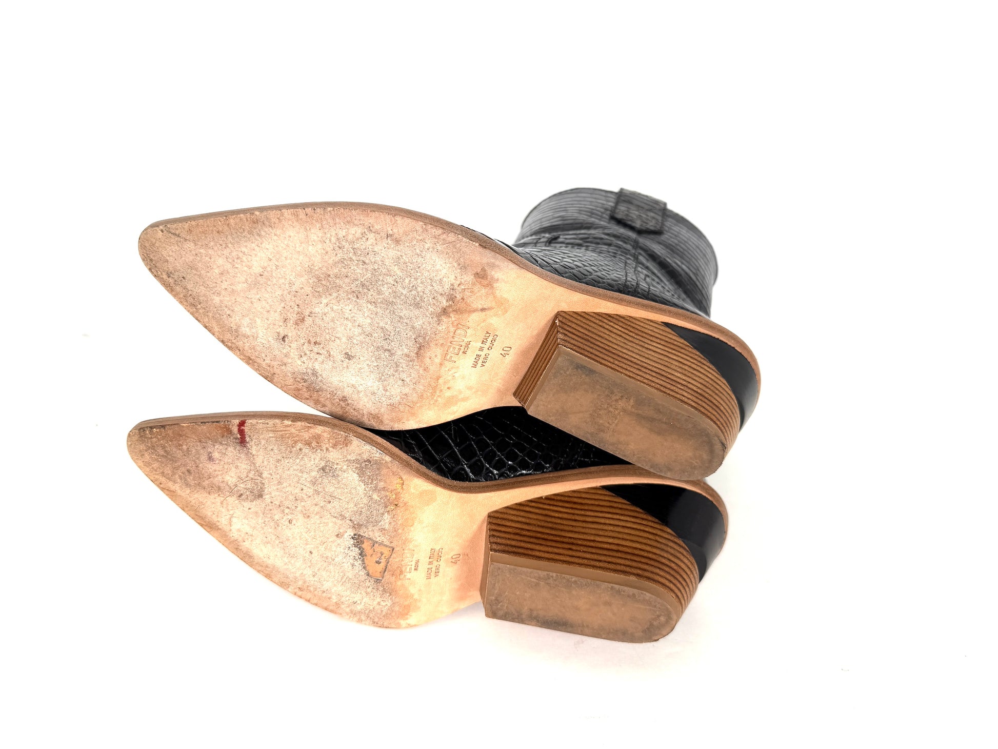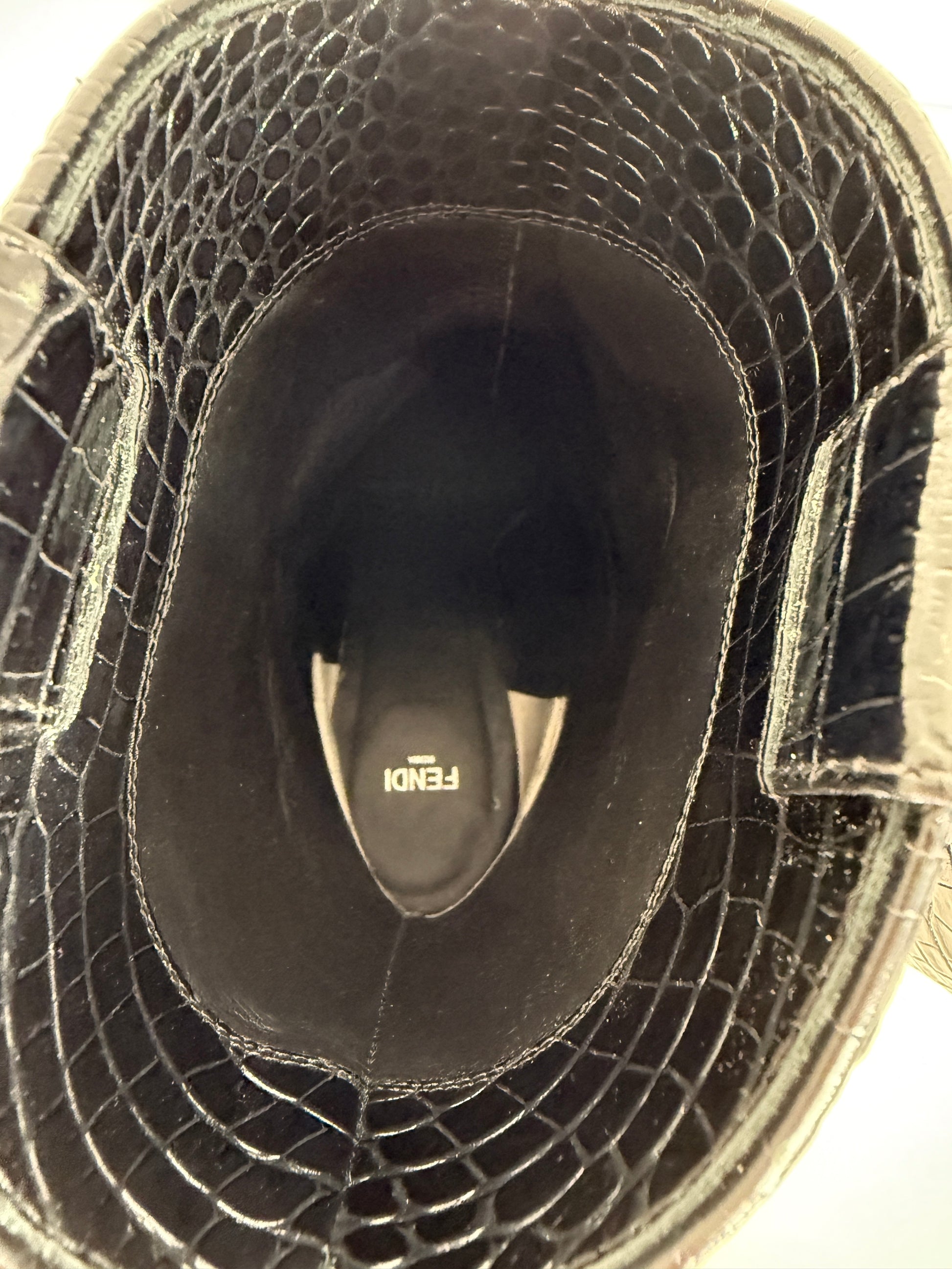 FENDI Black Animal Print Western Mid Calf Tronchetto Vitello Stampa Cocco Pointed Toe Boots 40, 9.5
