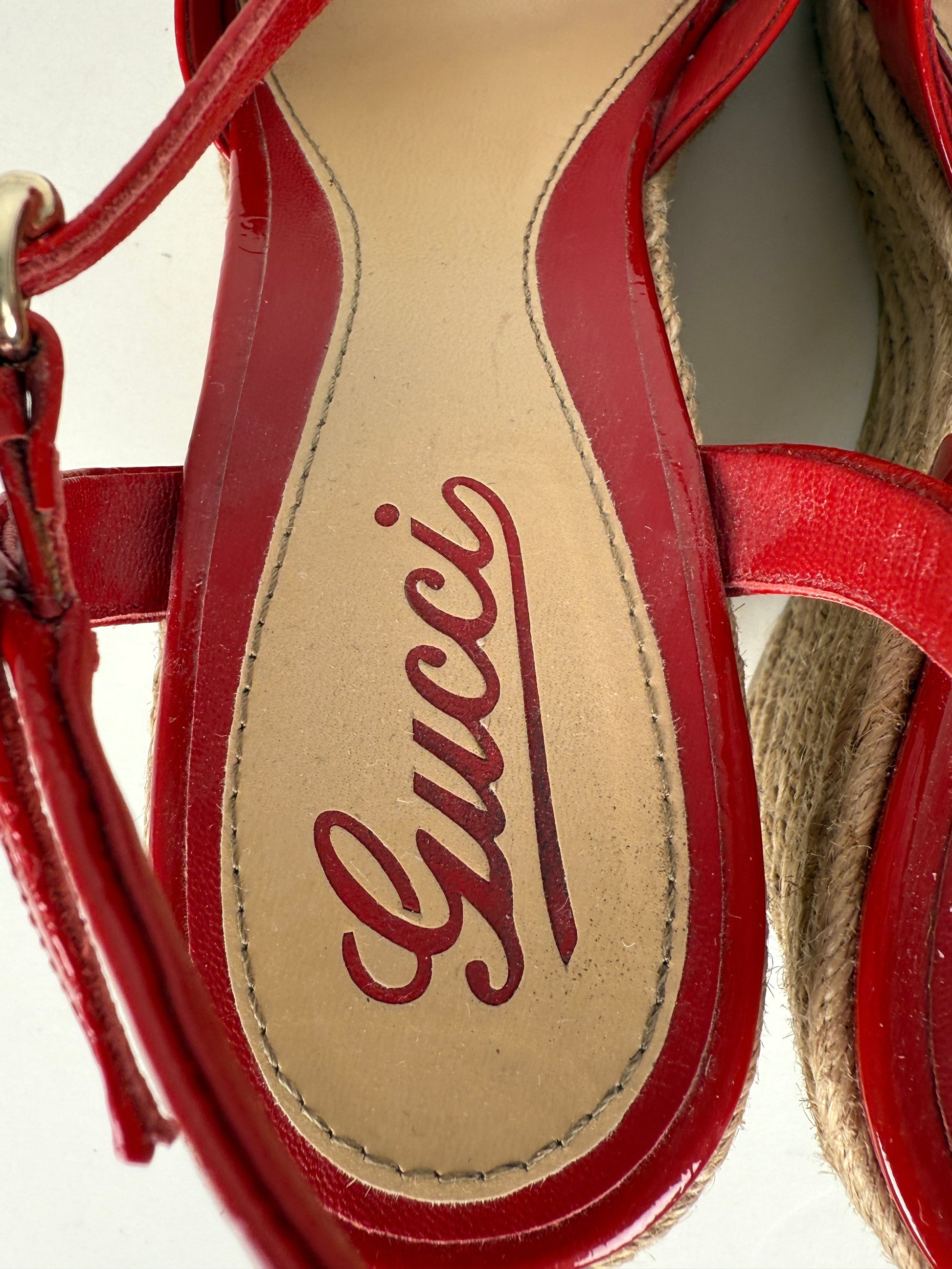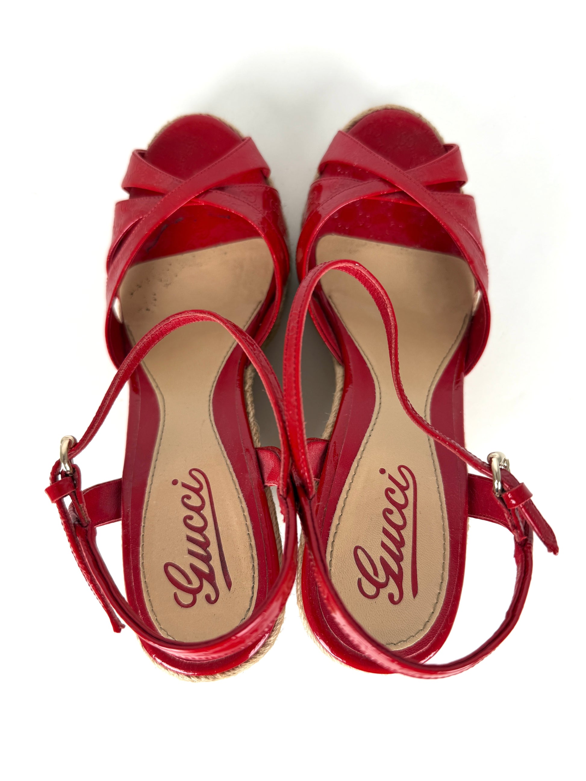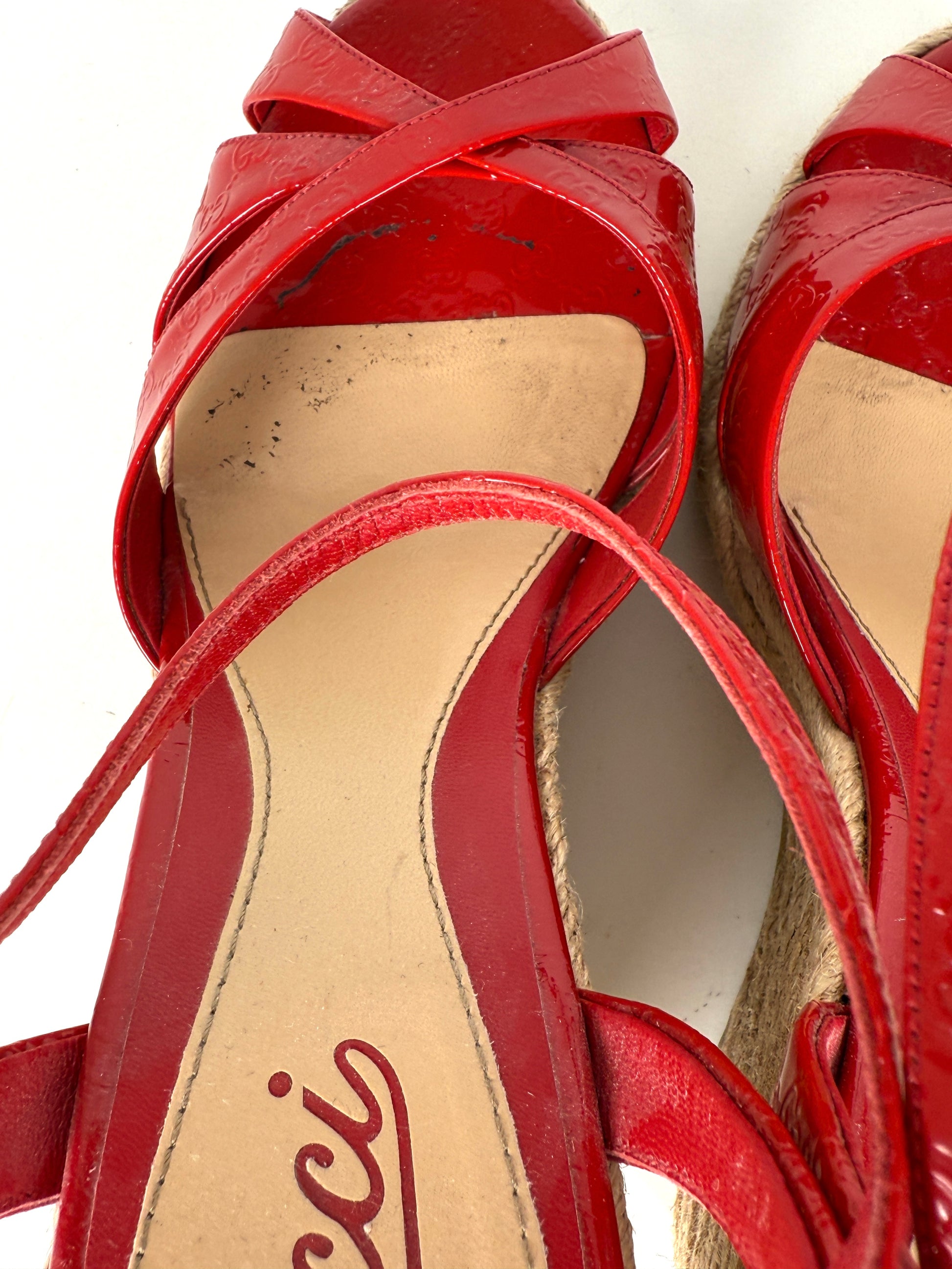 Gucci Micro GG Red Patent Leather Platform Wedge Sandals Heels 39.5 9.5