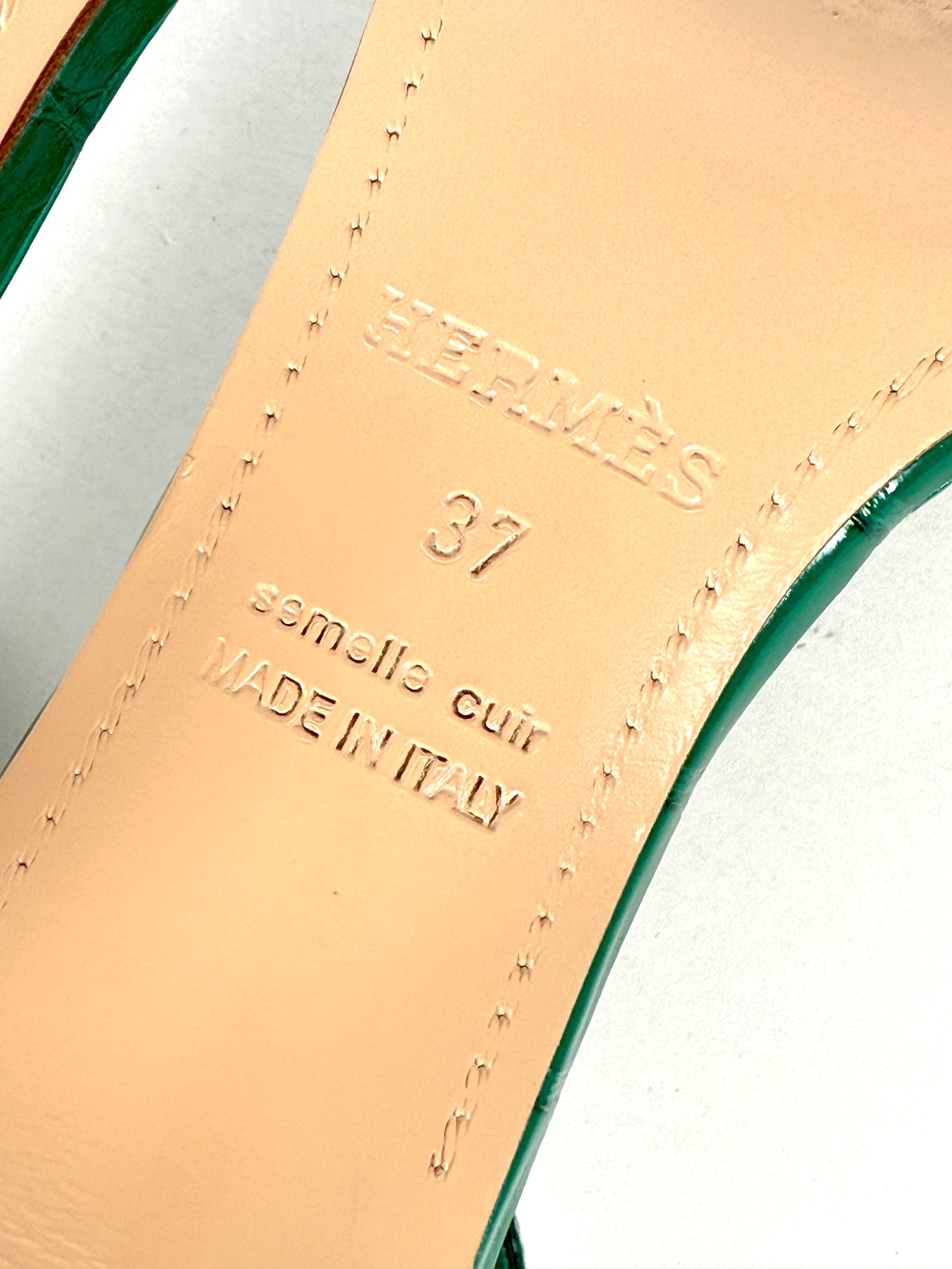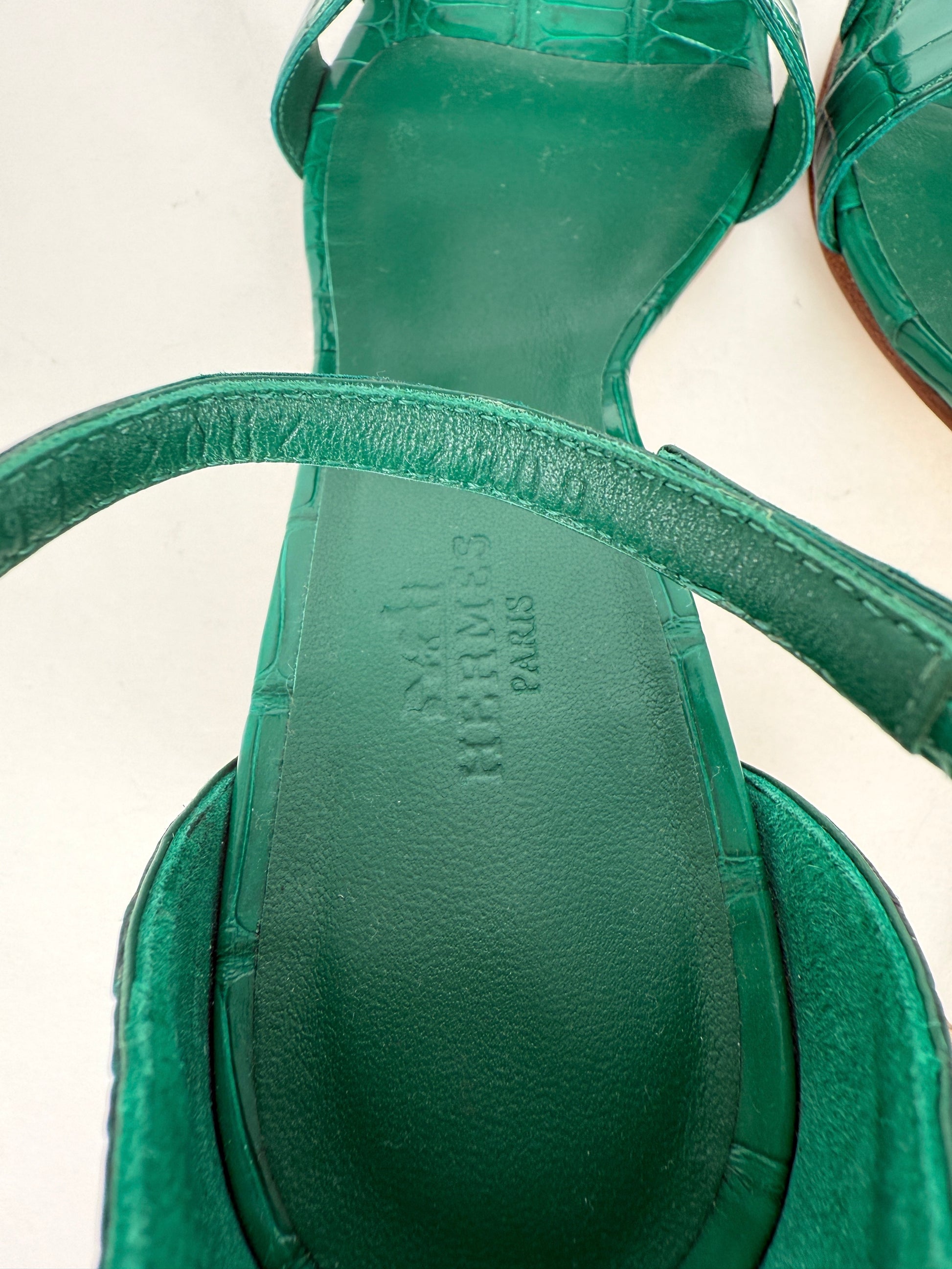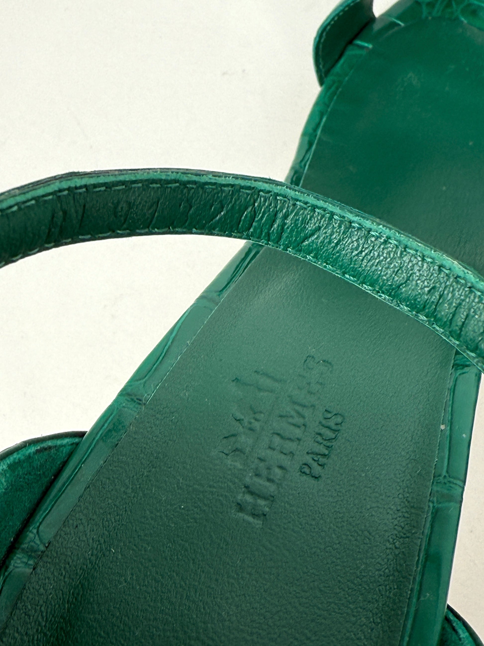 HERMES Joy 70 Special Order Green Shiny Mississippiensis Alligator Sandals Heels 37 6.5