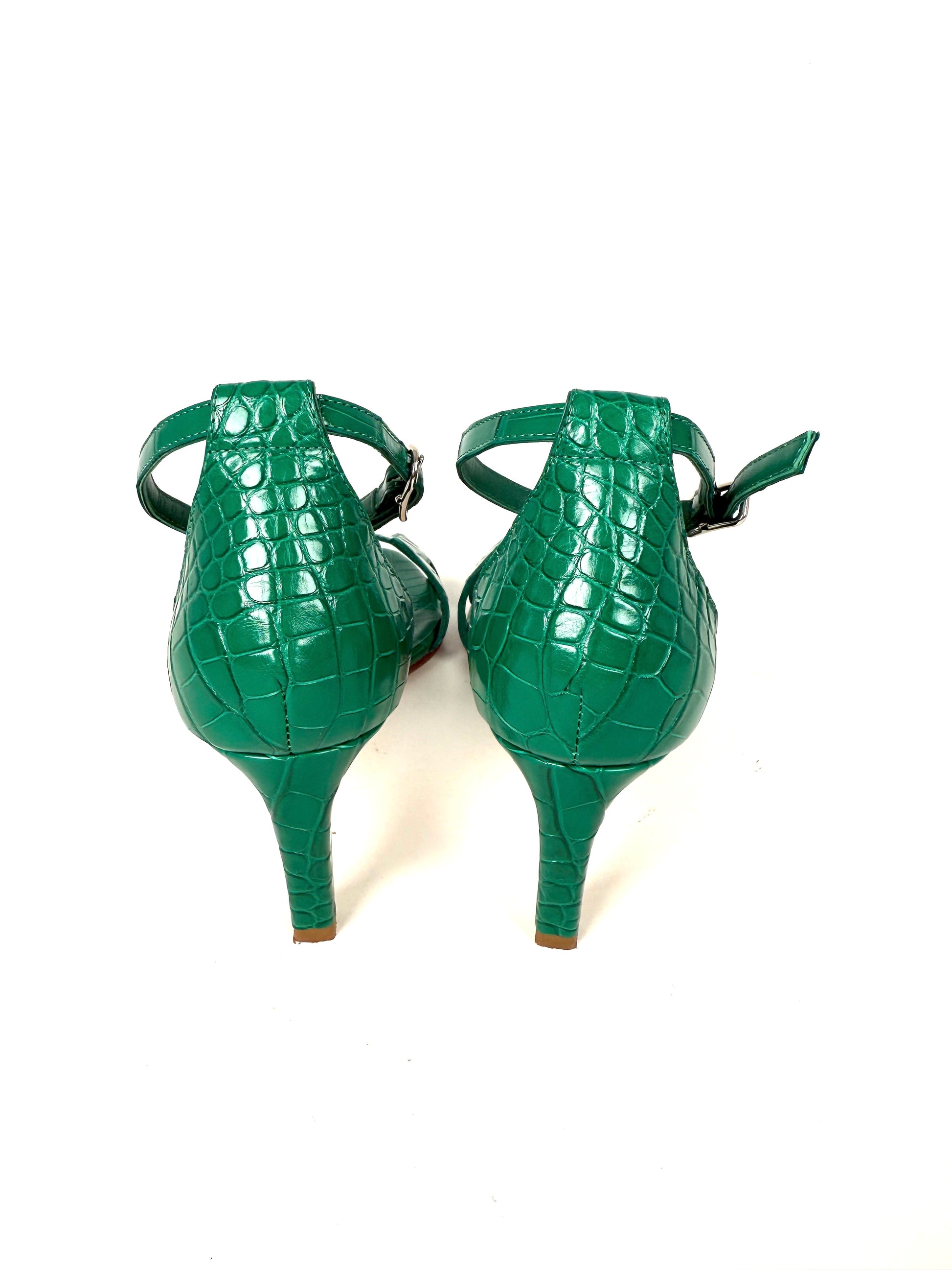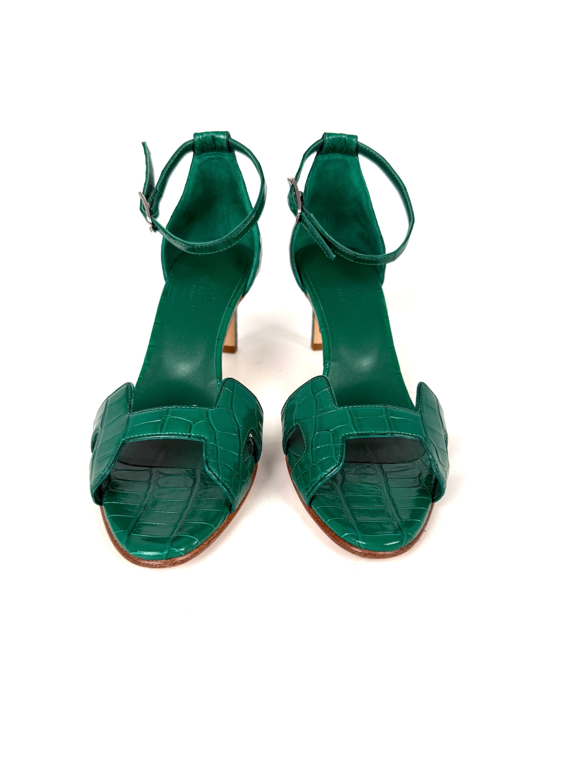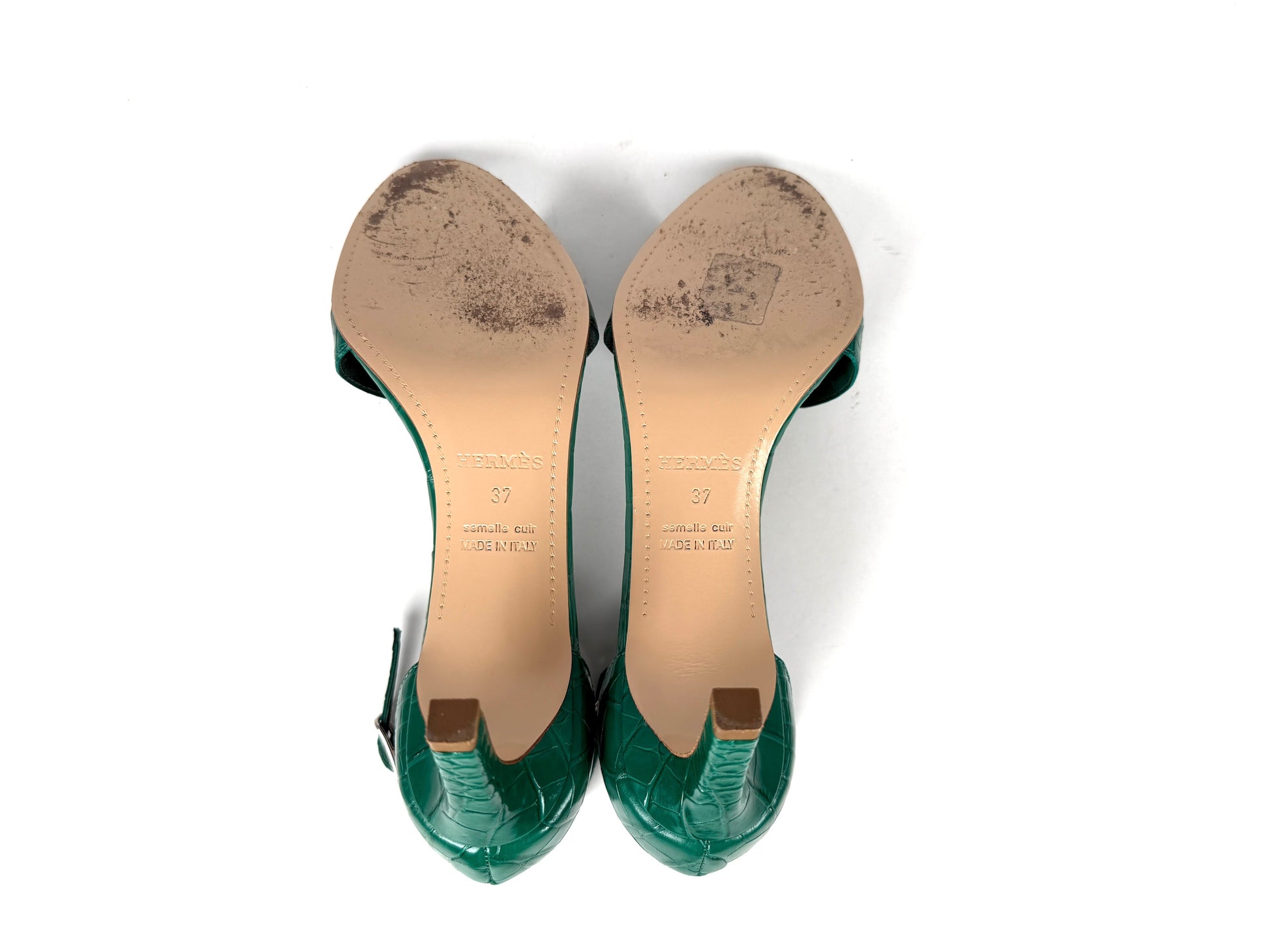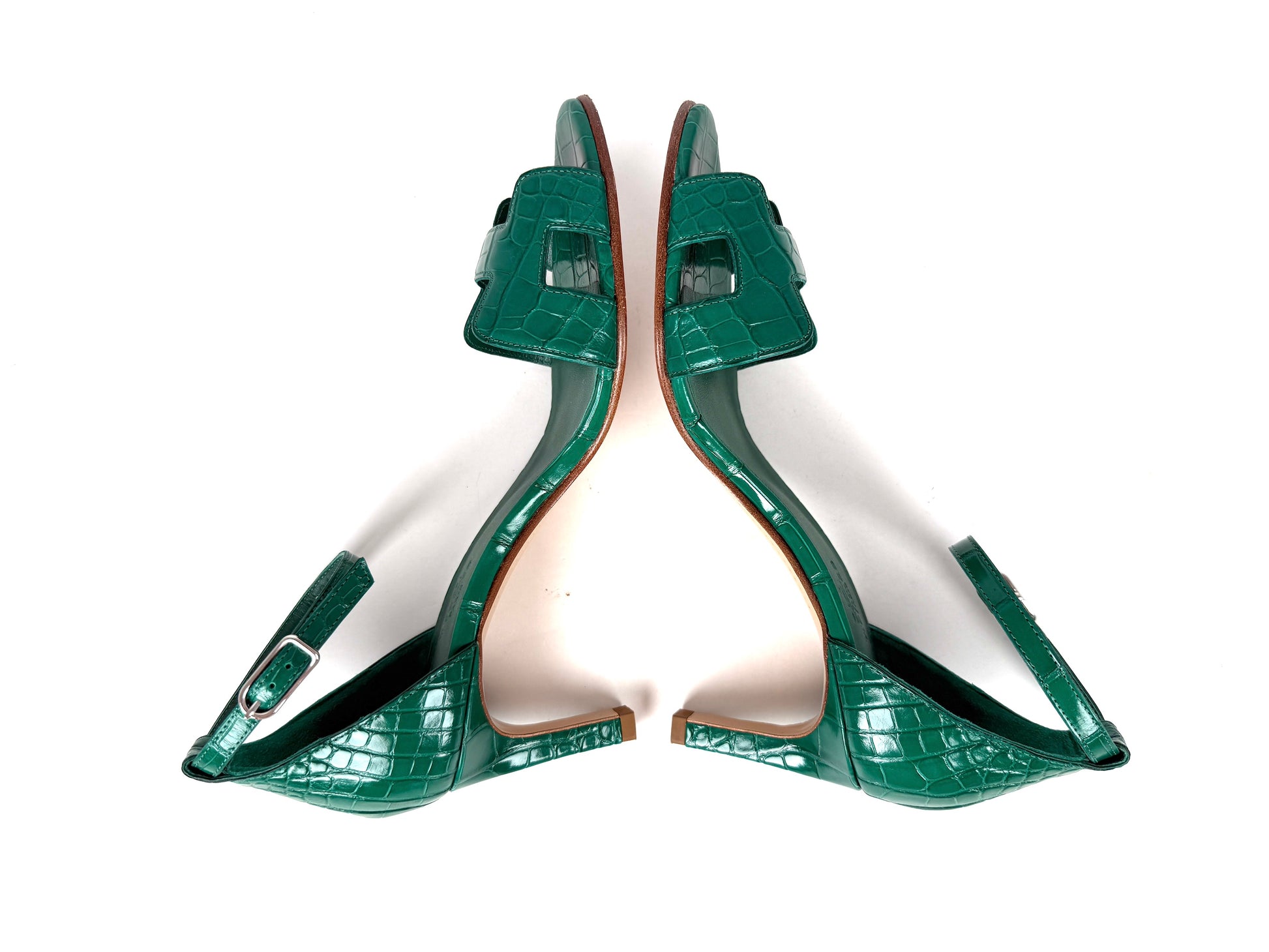 HERMES Joy 70 Special Order Green Shiny Mississippiensis Alligator Sandals Heels 37 6.5