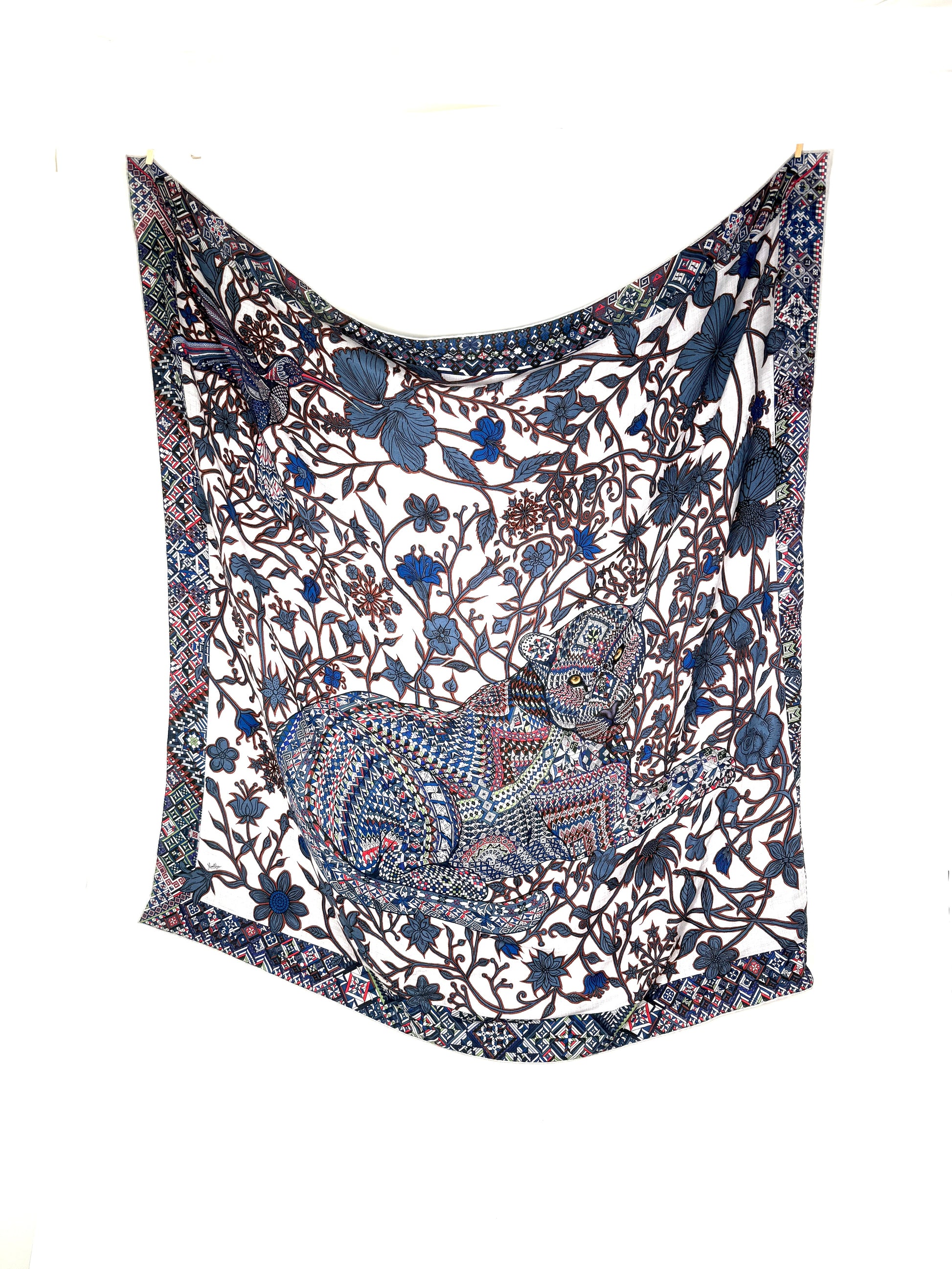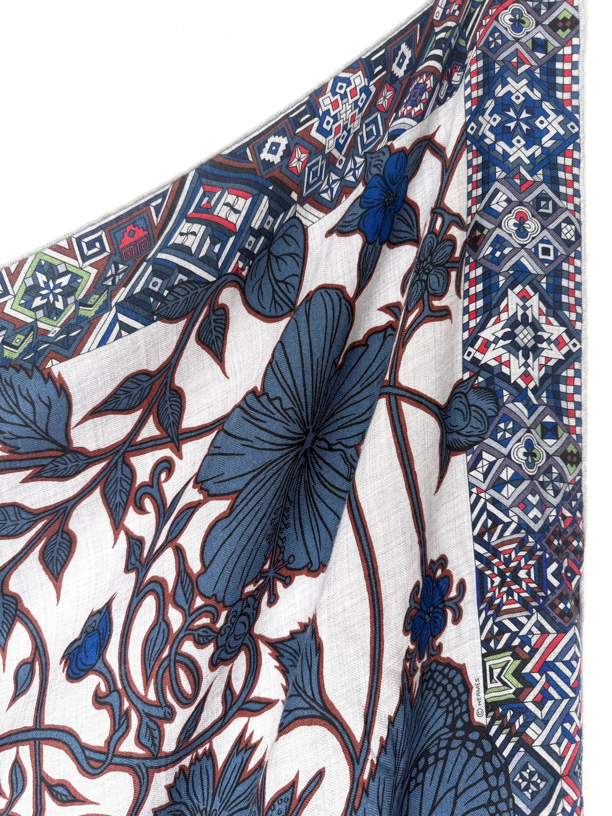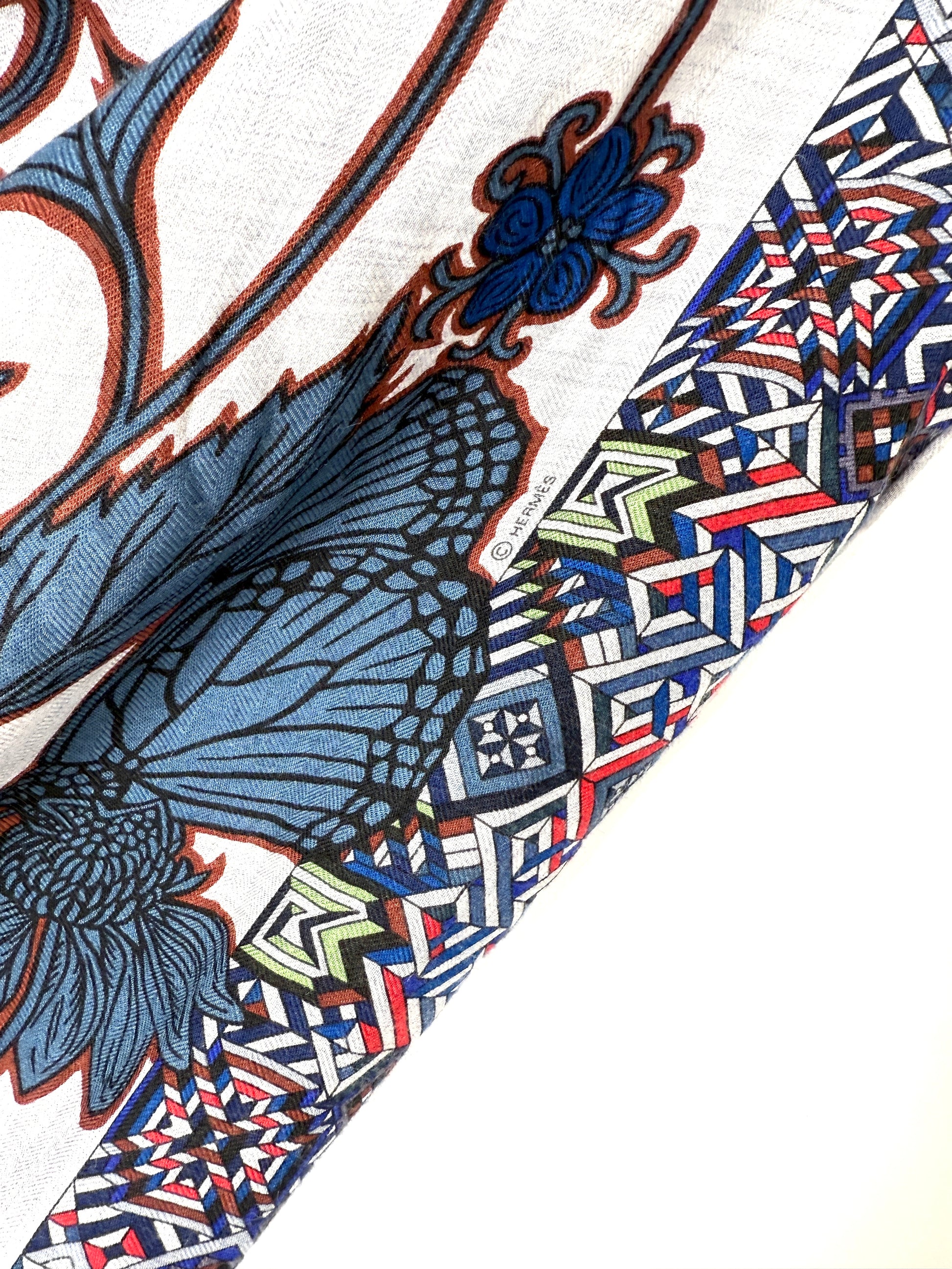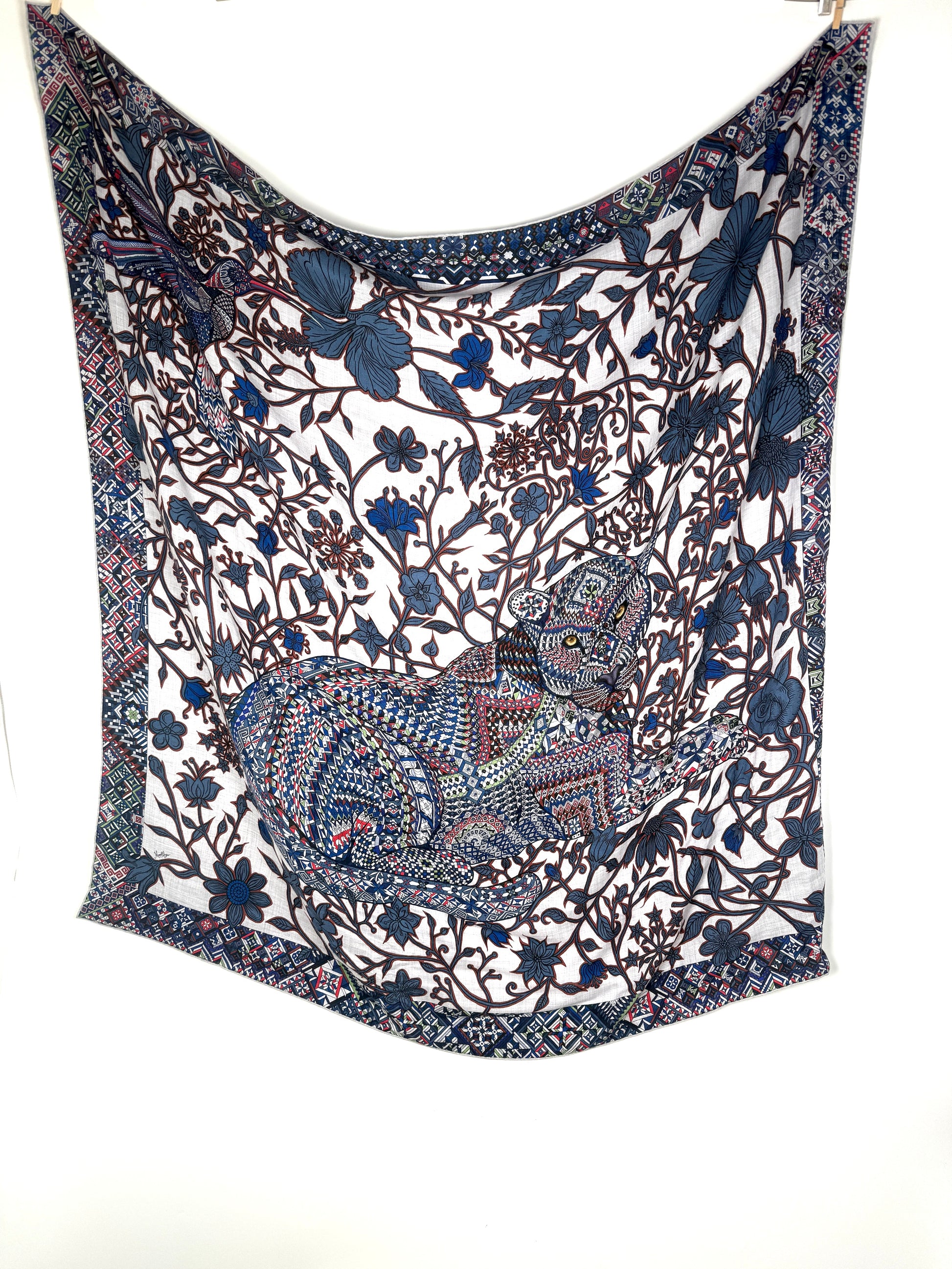 HERMES Le Jaguar Et Le Colibri Gris Chine Bleu Acajou Cashmere 140 Shawl Scarf
