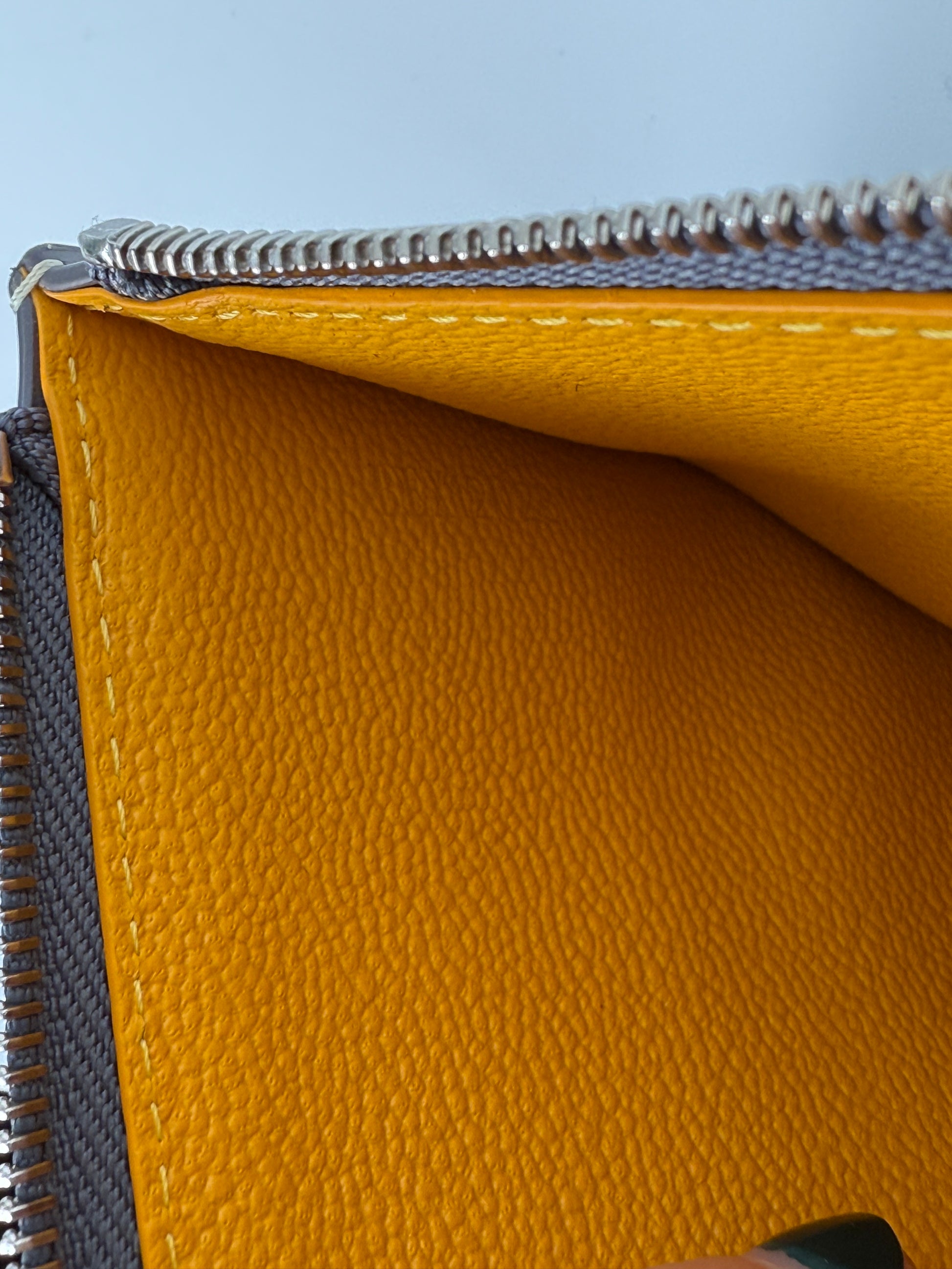Features: 12 credit card slots, zip coin compartment, yellow leather interior.