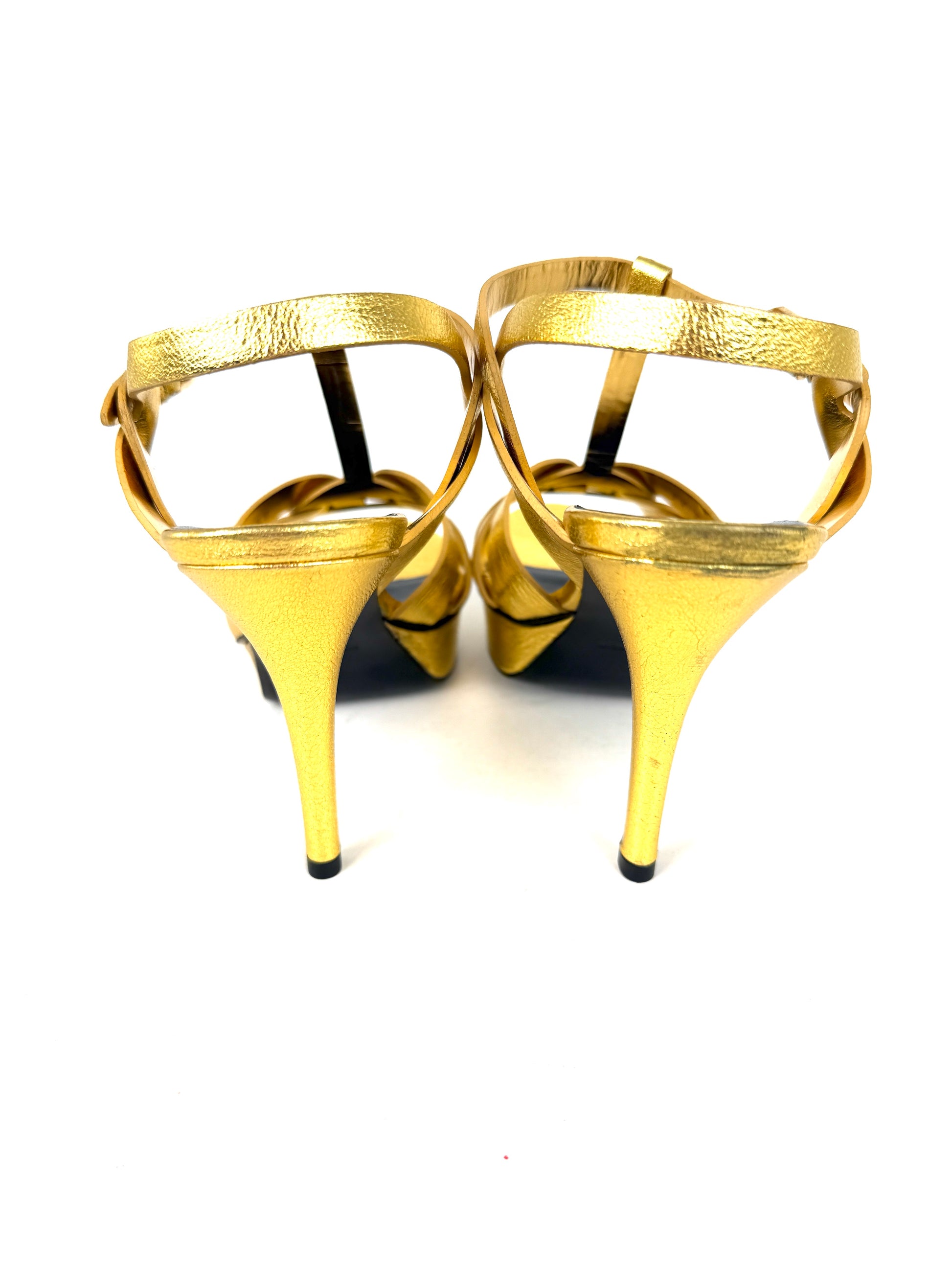 New Saint Laurent YSL Tribute Gold Leather Platform Heel Sandals 38, 7.5