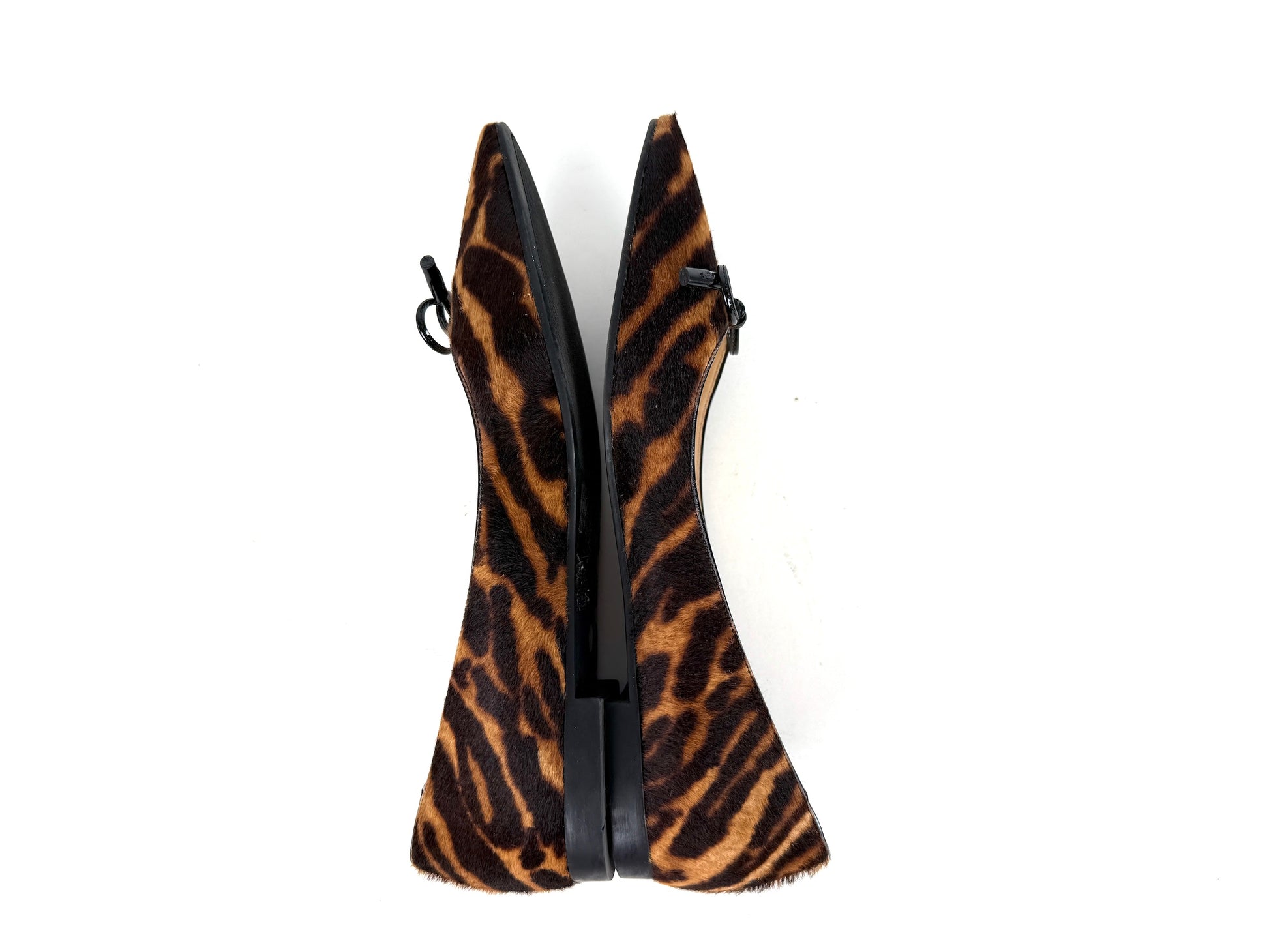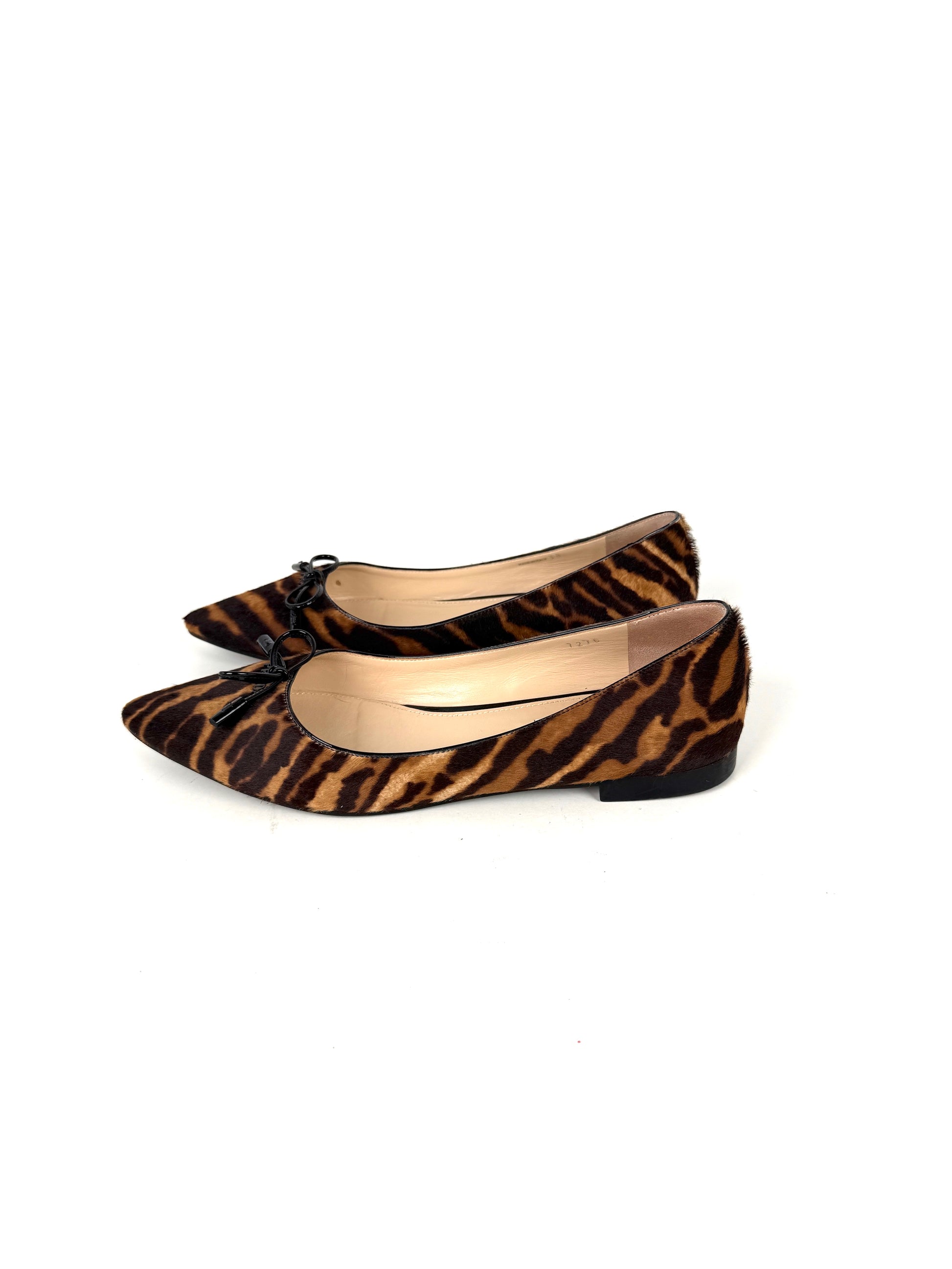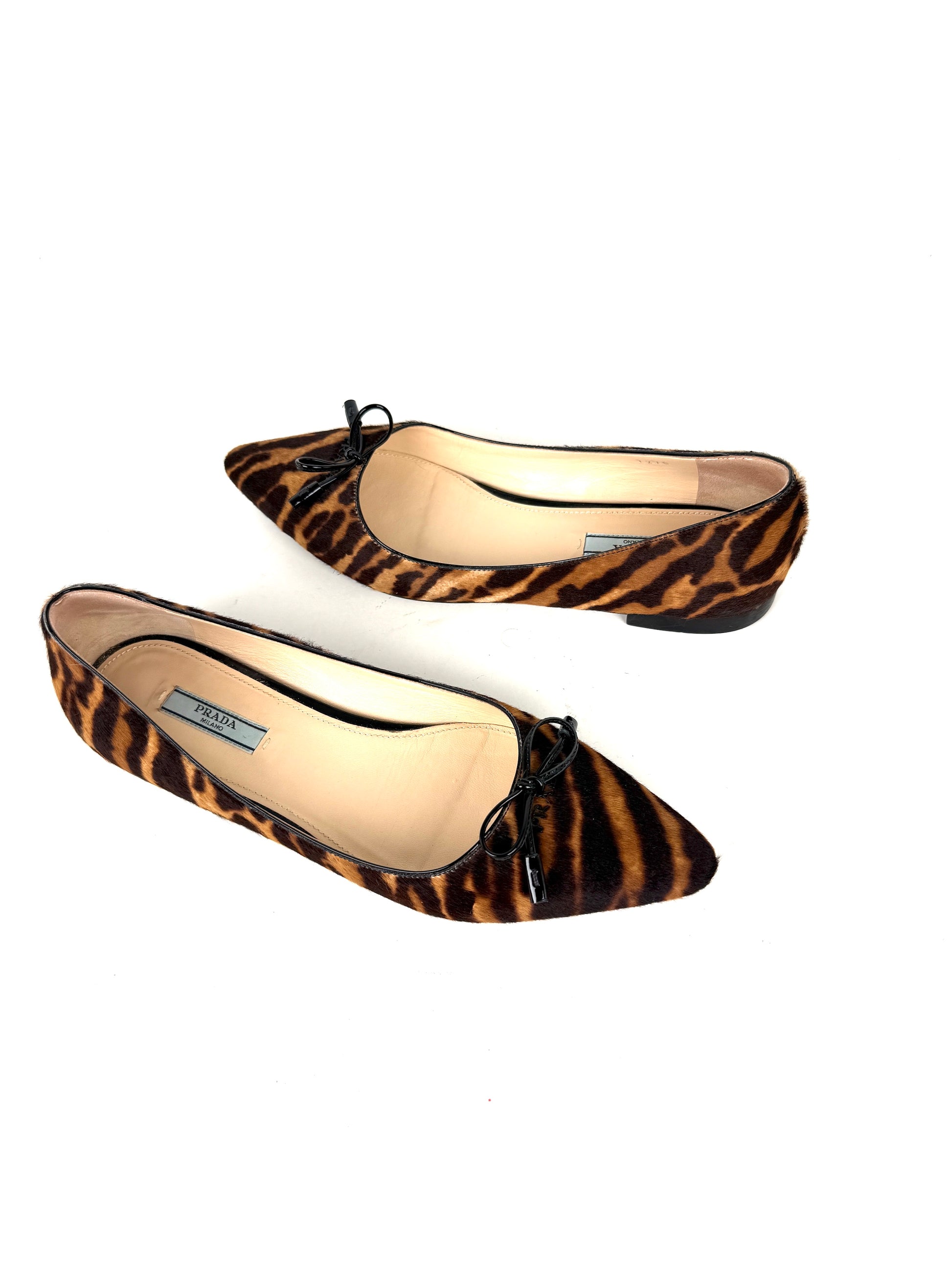 PRADA Cavallino Leopard Calf Hair Bow Pointed Toe Flats 38, 7.5